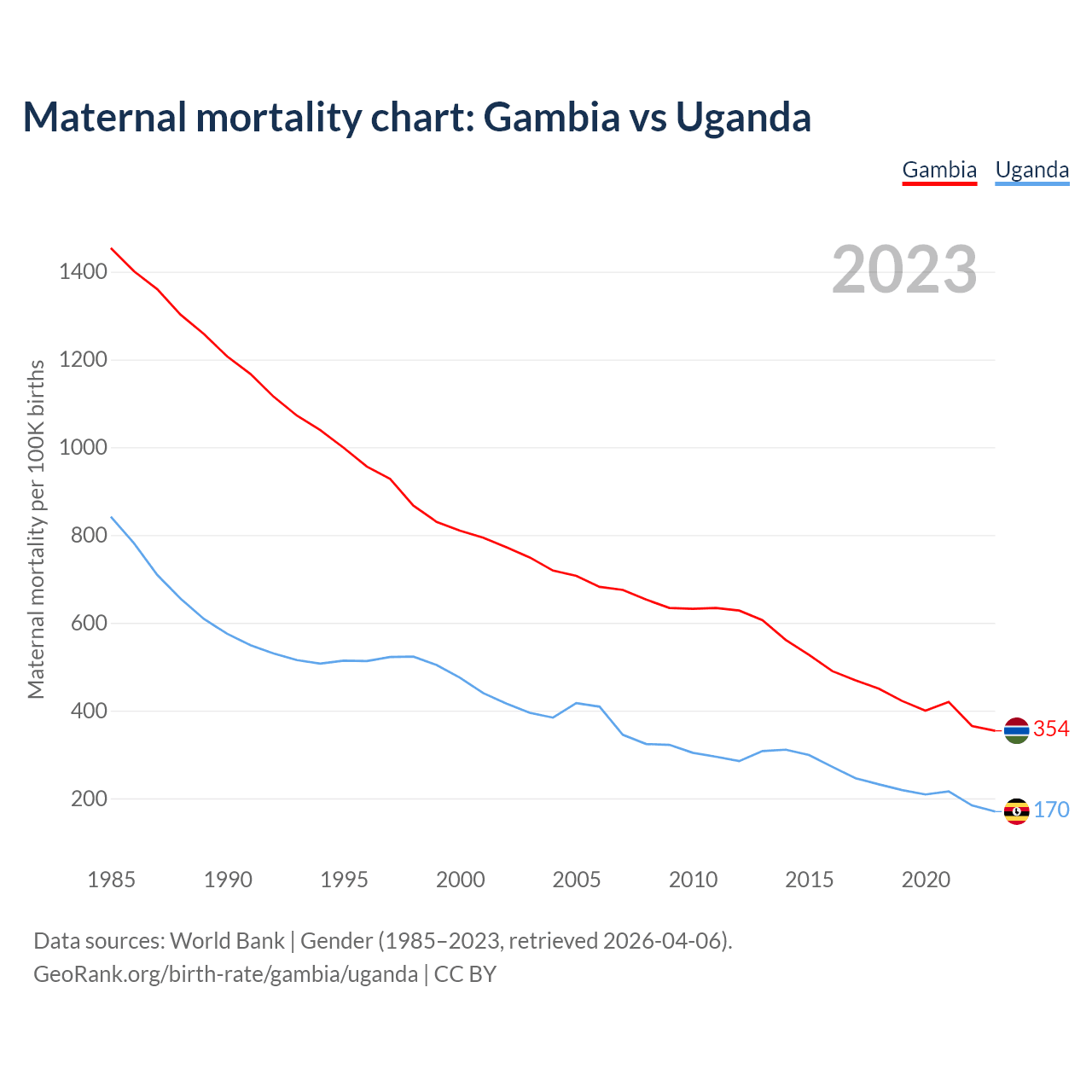 The maternal mortality rate, which is the probability of dying during childbirth or within 42 days of pregnancy termination, is 354 deaths per 100,000 live births in the Gambia, compared to 170 deaths in Uganda.