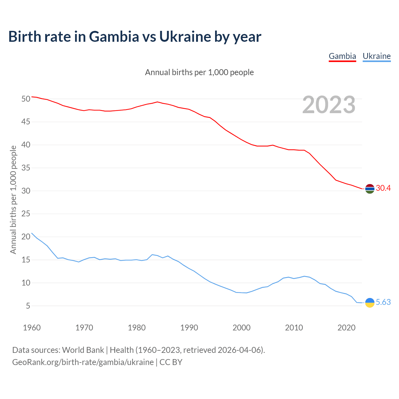 The Gambia has an annual birth rate of 30.4 births per 1,000 people, compared to 5.63 for Ukraine. The average number of children a woman is expected to have during her lifetime — the fertility rate, is 4.01 in the Gambia and 0.98 in Ukraine — 75.6% difference.