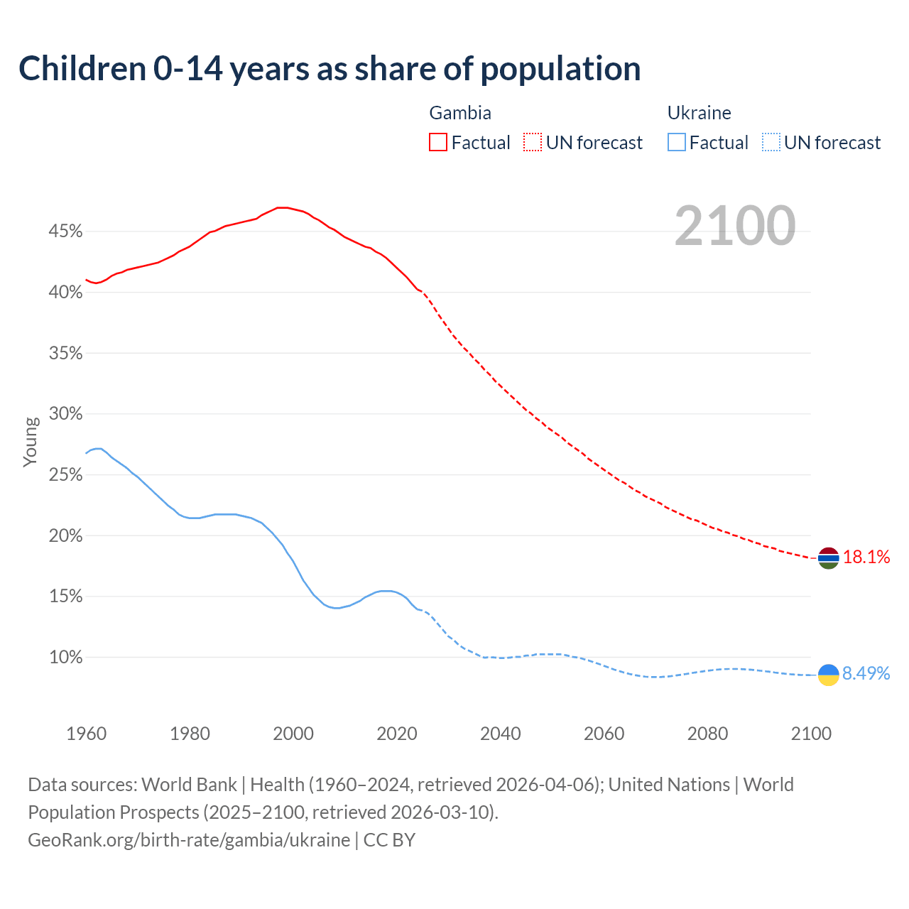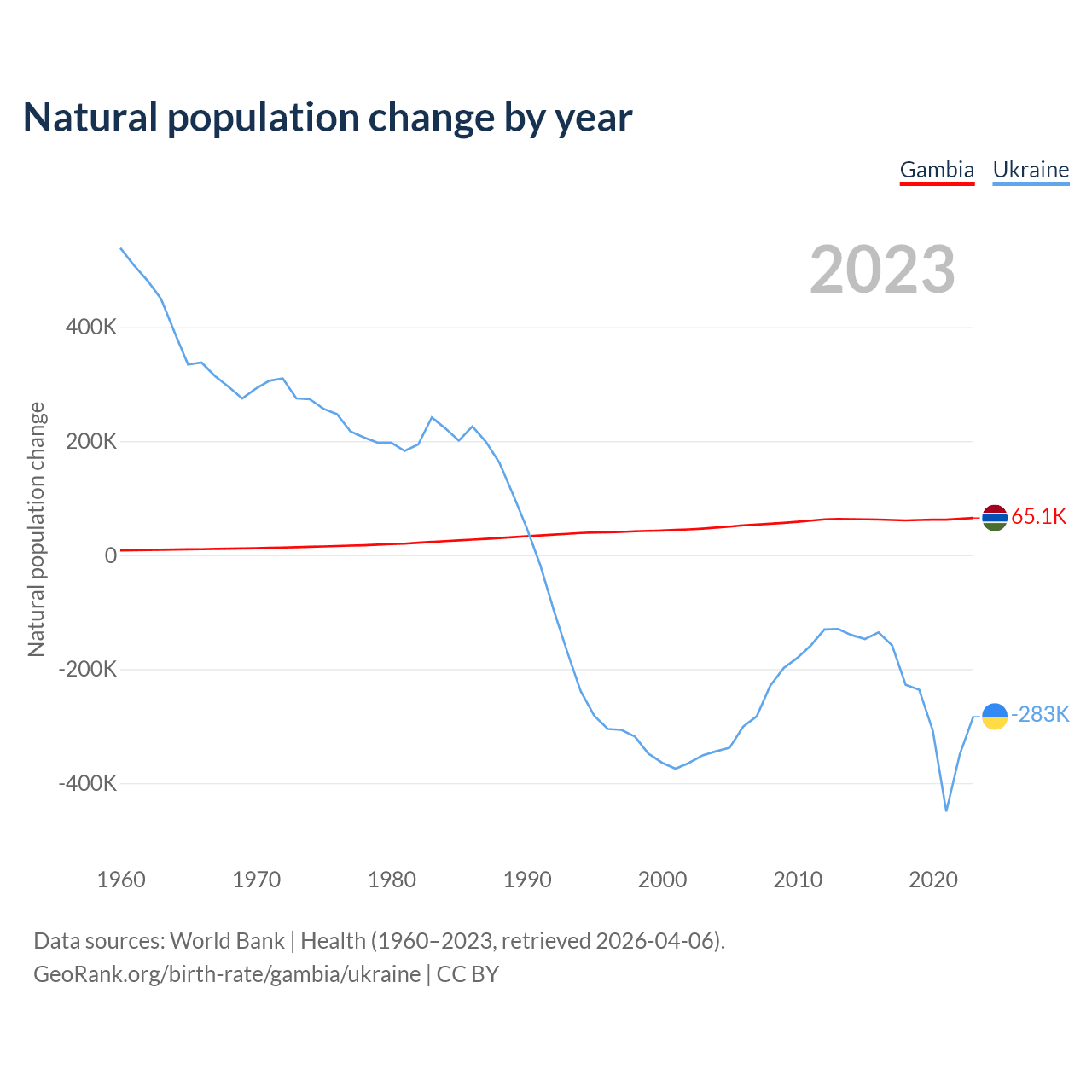 According to the latest available data on birth rates, the fertility rate in the Gambia was 4.01 children per woman in 2023, compared to 0.98 in Ukraine in 2023. The replacement level is considered to be 2.1 children per woman.