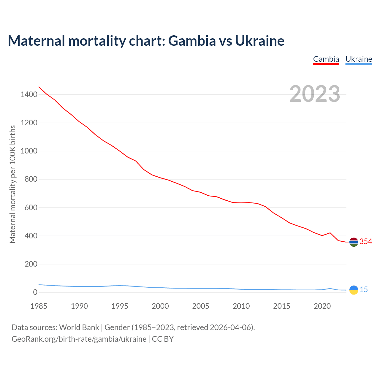 The maternal mortality rate, which is the probability of dying during childbirth or within 42 days of pregnancy termination, is 354 deaths per 100,000 live births in the Gambia, compared to 15 deaths in Ukraine.