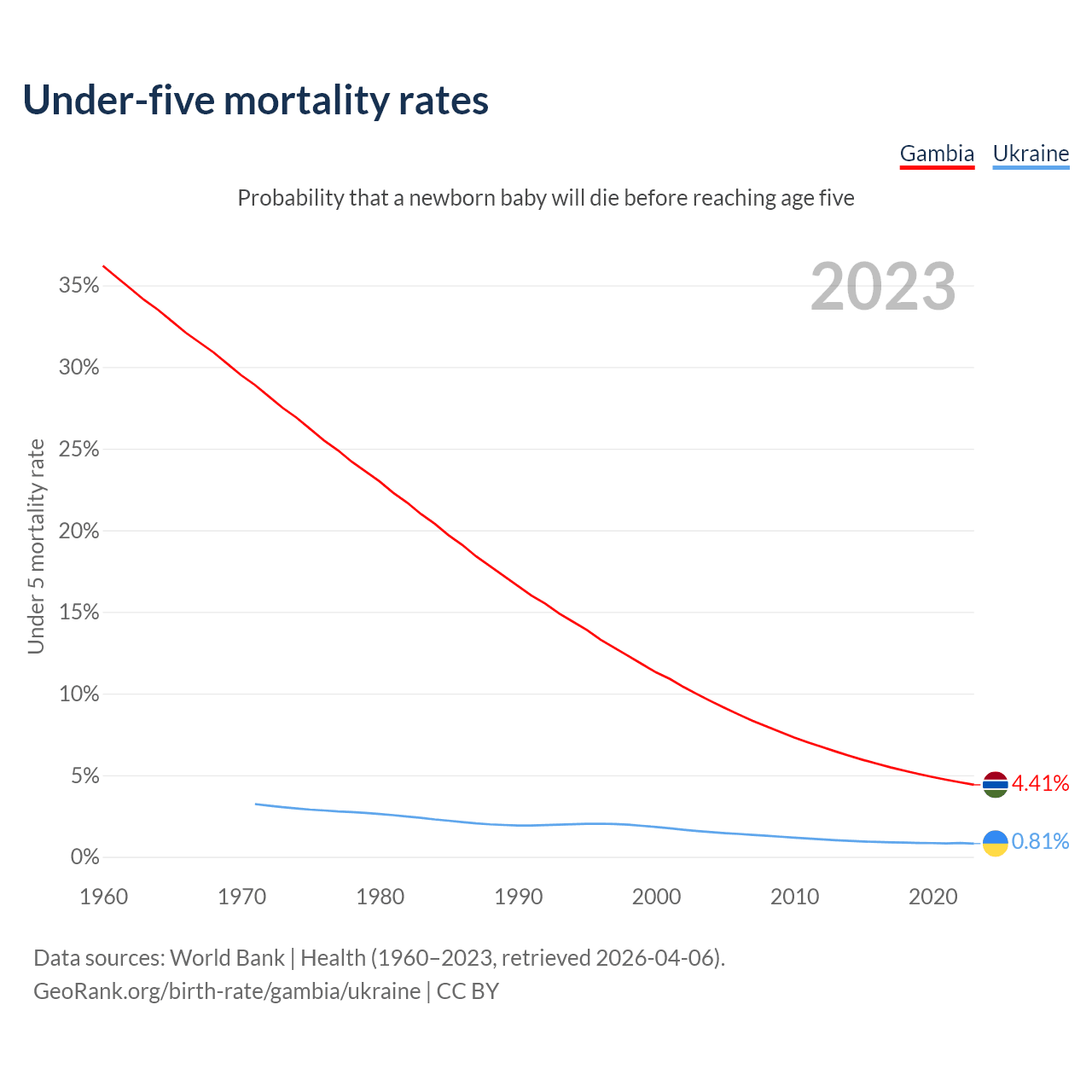 The chance that a newborn baby will die before reaching age five is 4.41% in the Gambia and 0.81% in Ukraine. Above is a chart with historical data on under-five mortality rates.