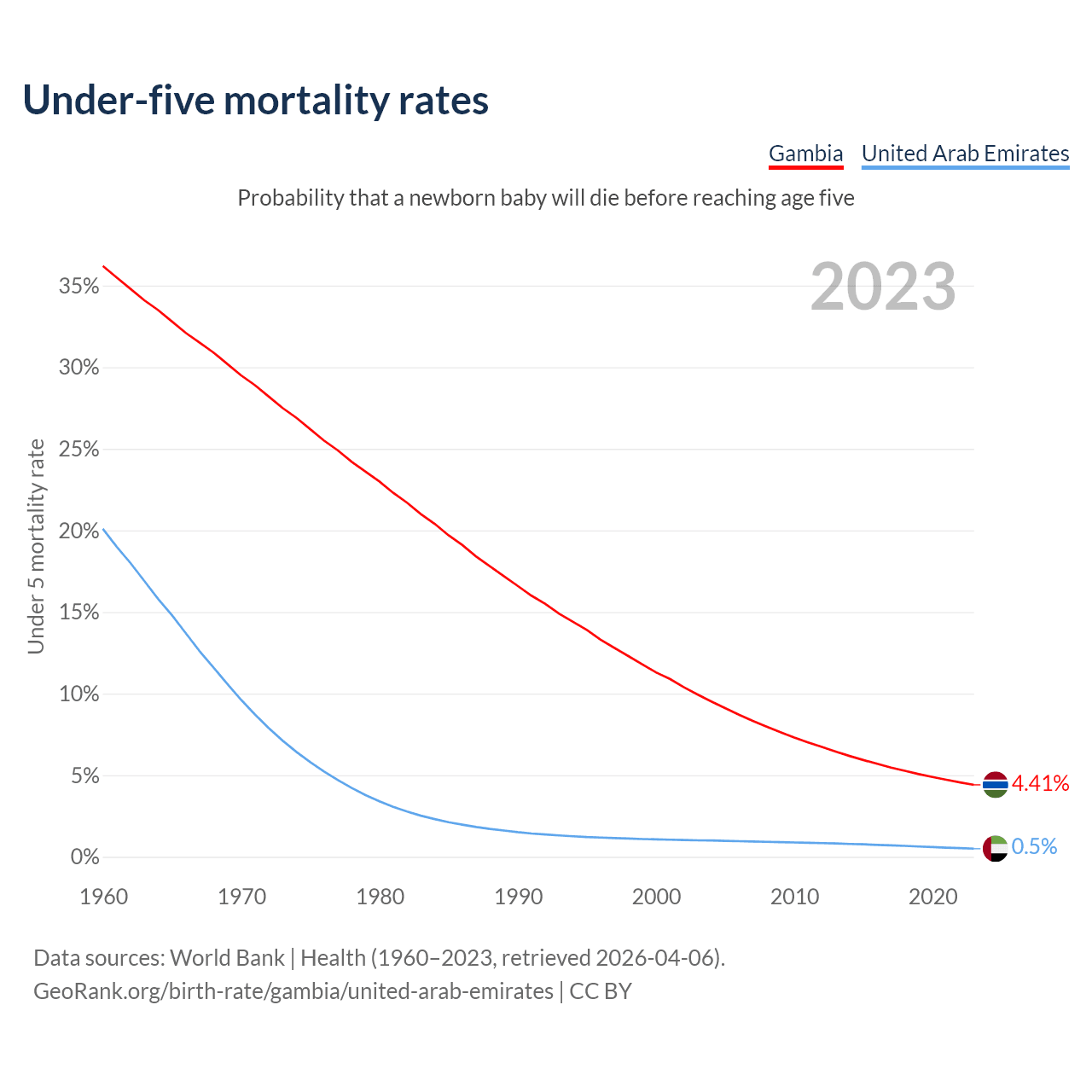 The chance that a newborn baby will die before reaching age five is 4.41% in the Gambia and 0.5% in the United Arab Emirates. Above is a chart with historical data on under-five mortality rates.