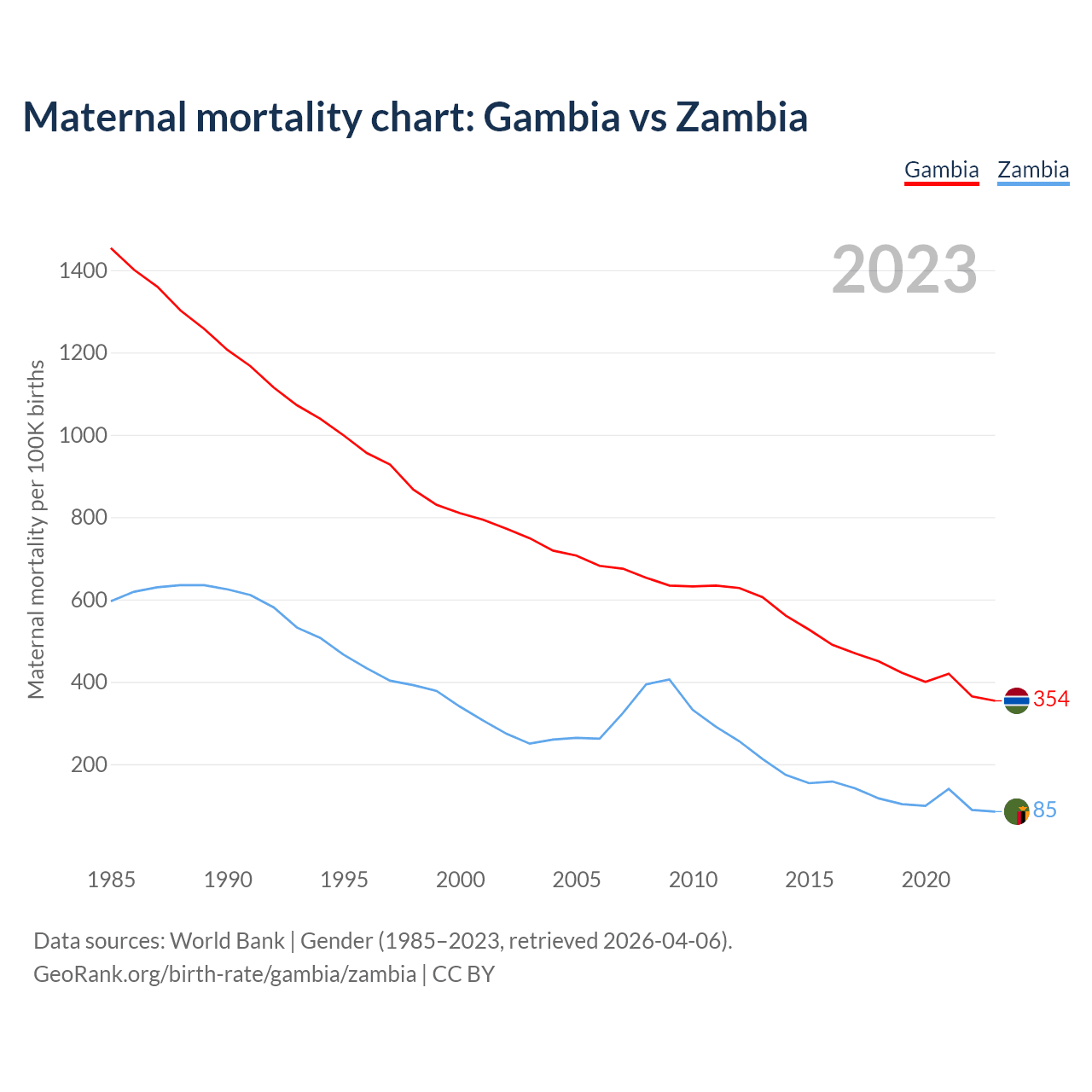 The maternal mortality rate, which is the probability of dying during childbirth or within 42 days of pregnancy termination, is 354 deaths per 100,000 live births in the Gambia, compared to 85 deaths in Zambia.