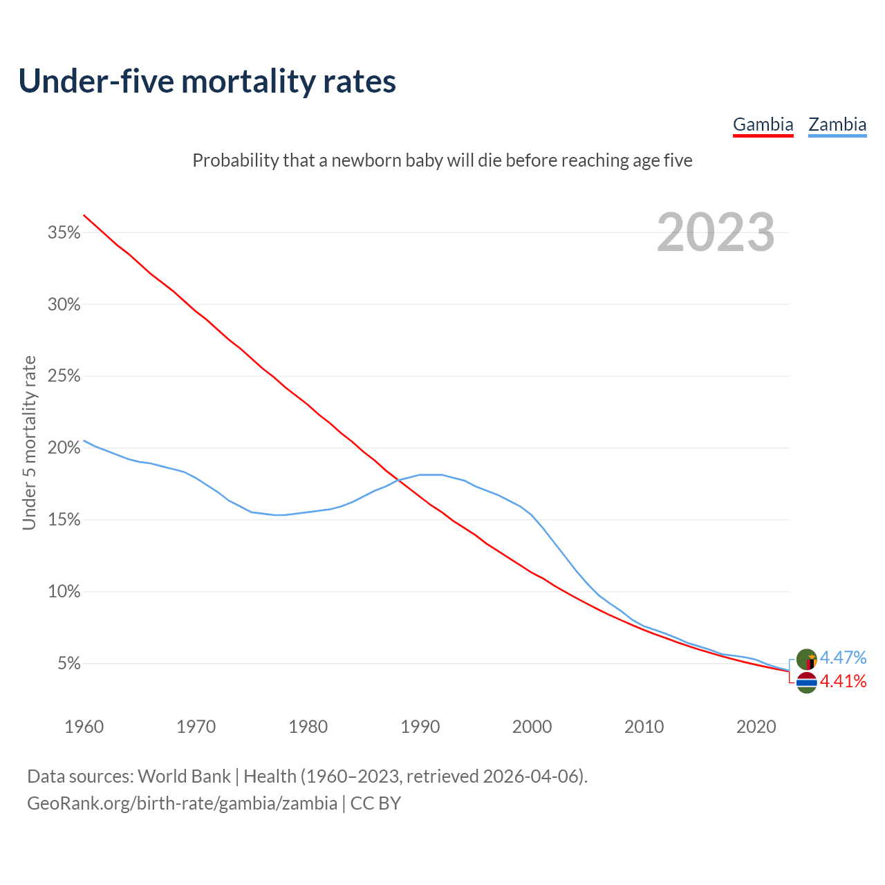 The chance that a newborn baby will die before reaching age five is 4.41% in the Gambia and 4.47% in Zambia. Above is a chart with historical data on under-five mortality rates.