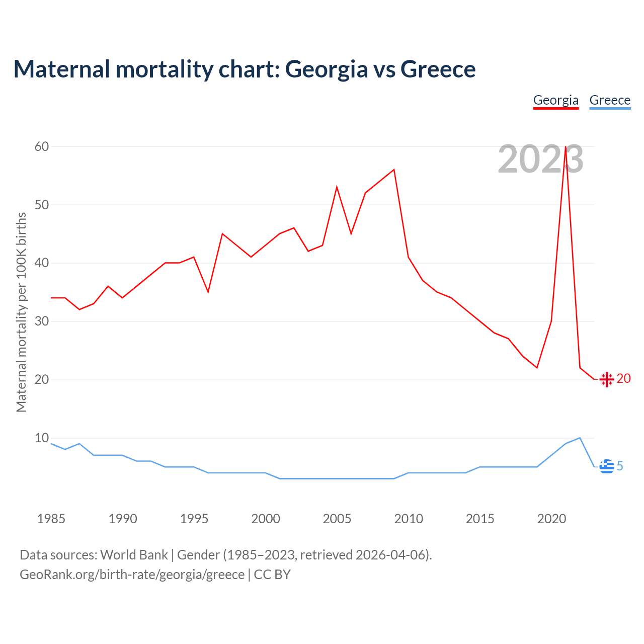 The maternal mortality rate, which is the probability of dying during childbirth or within 42 days of pregnancy termination, is 20 deaths per 100,000 live births in Georgia, compared to 5 deaths in Greece.