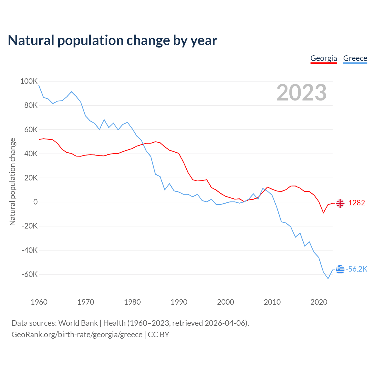 1960 vs 2023, the fertility rate has decreased by 38.5% in Georgia and by 40.8% in Greece — in 1960, it was 2.94 and 2.23, respectively.