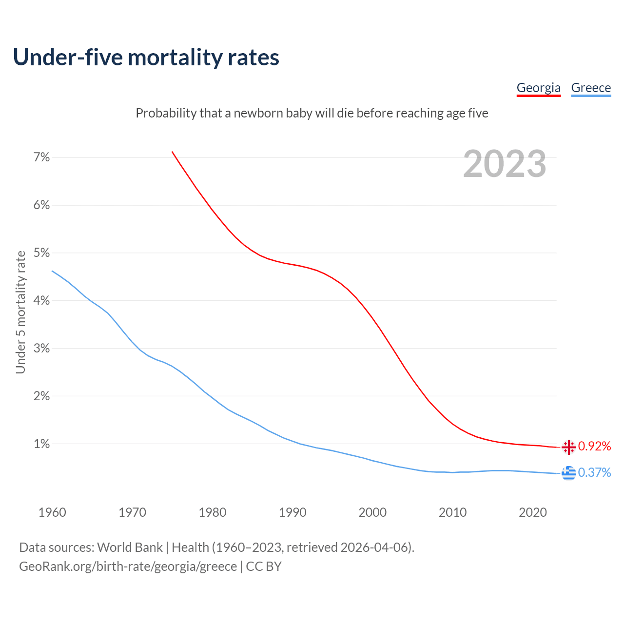 The chance that a newborn baby will die before reaching age five is 0.92% in Georgia and 0.37% in Greece. Above is a chart with historical data on under-five mortality rates.