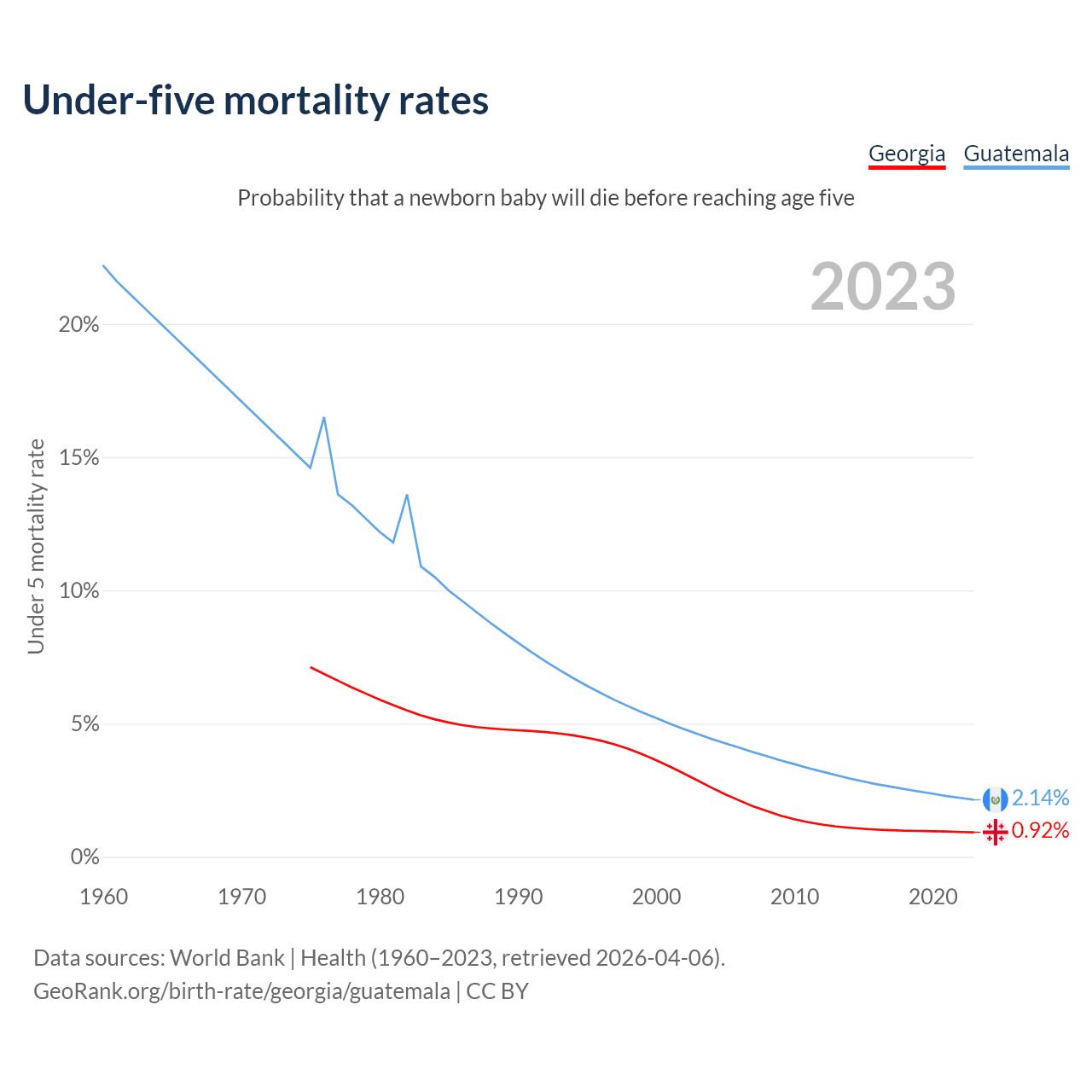 The chance that a newborn baby will die before reaching age five is 0.92% in Georgia and 2.14% in Guatemala. Above is a chart with historical data on under-five mortality rates.