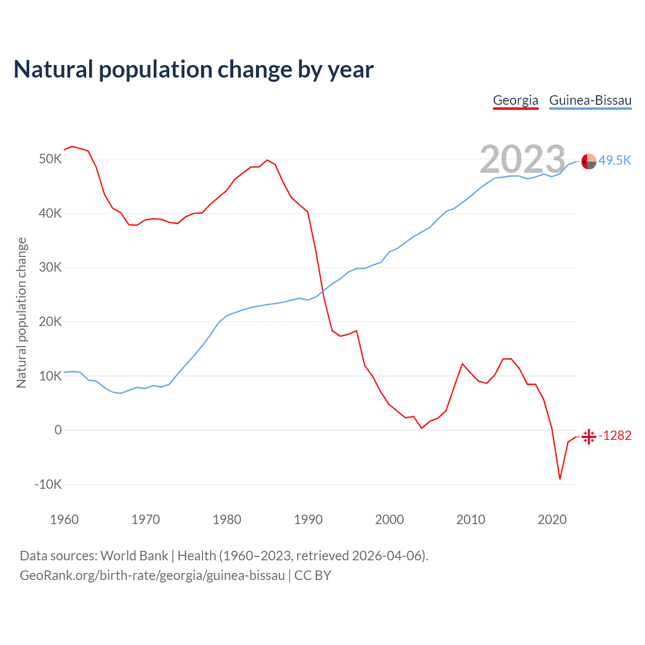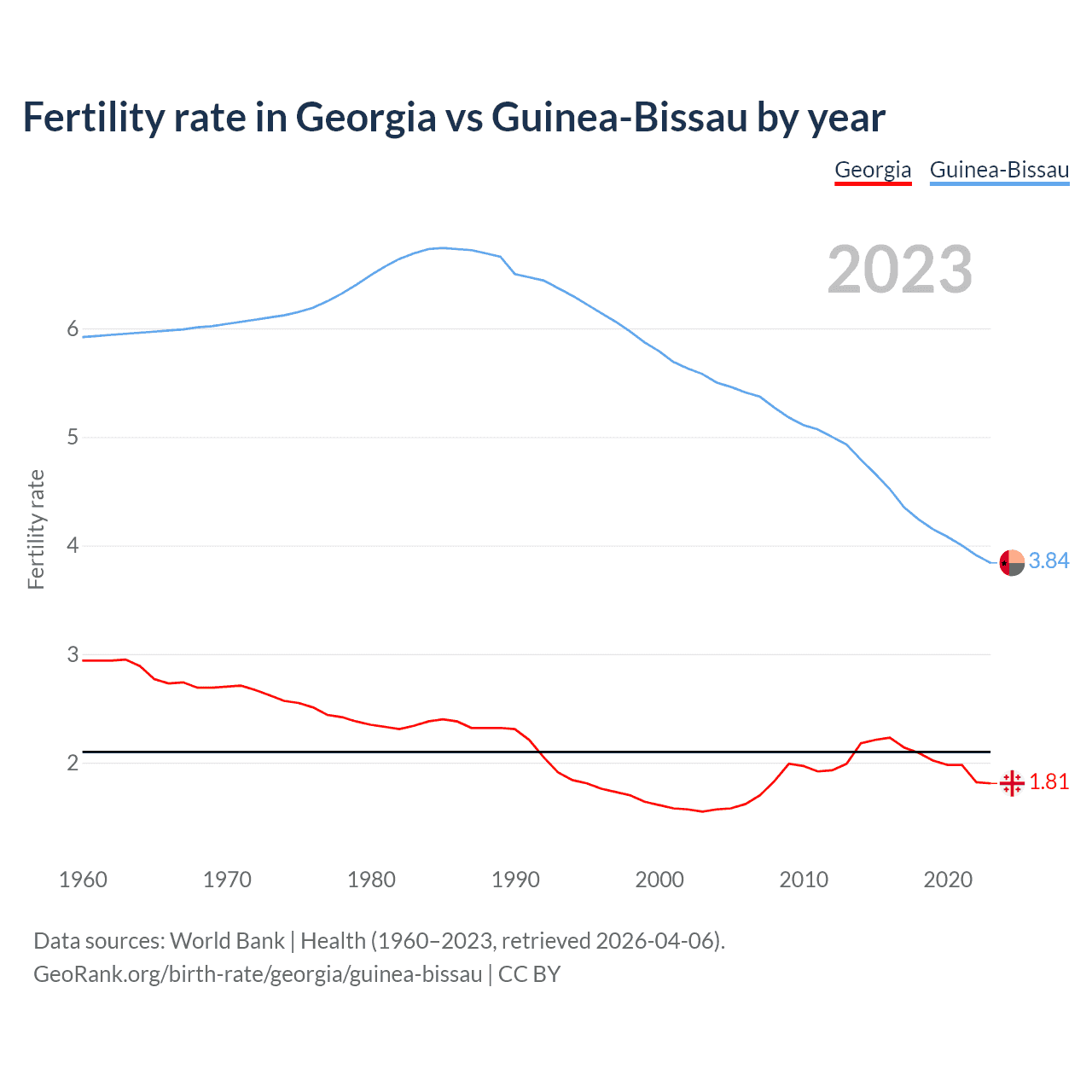 1960 vs 2023, the fertility rate has decreased by 38.5% in Georgia and by 35.2% in Guinea-Bissau — in 1960, it was 2.94 and 5.92, respectively.