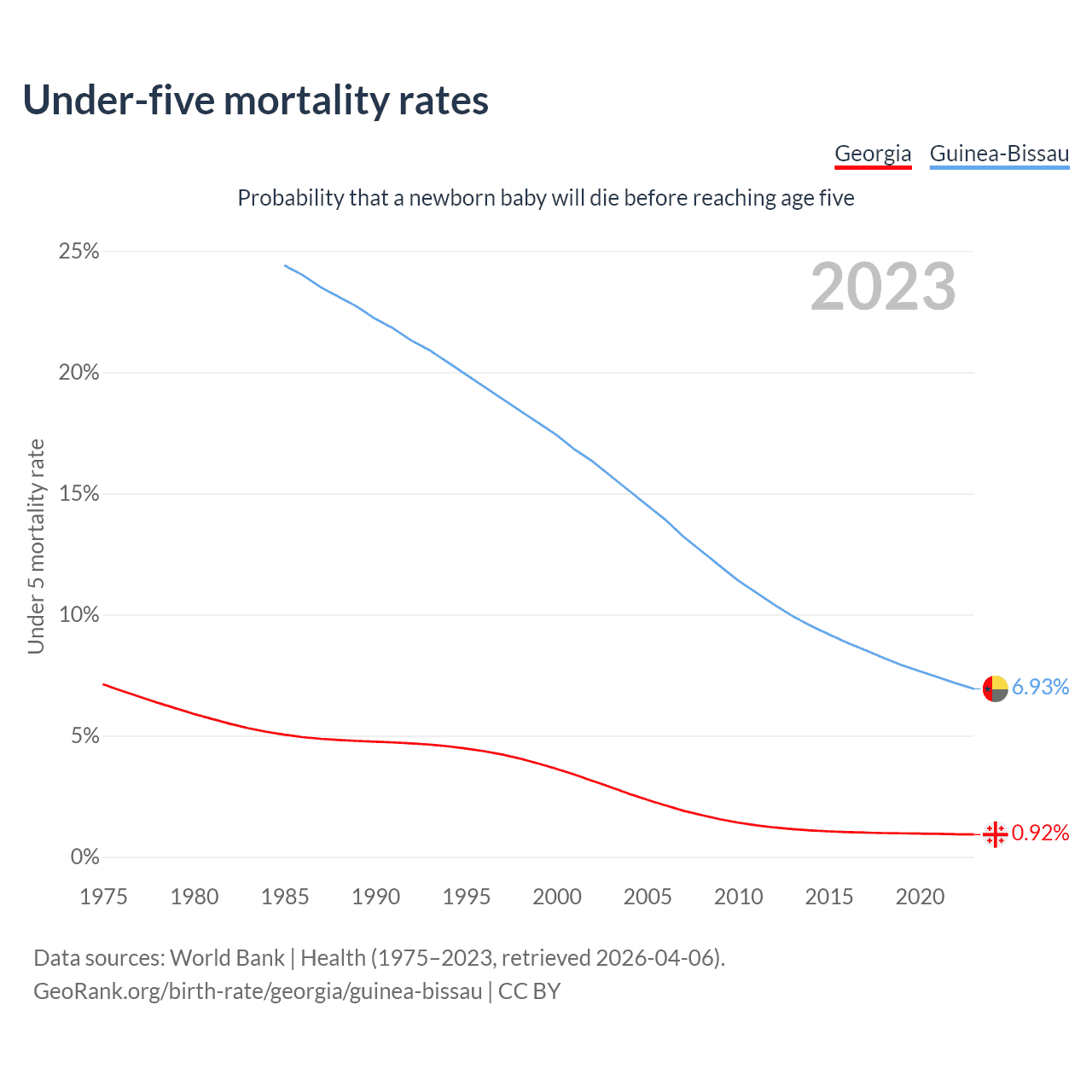 The chance that a newborn baby will die before reaching age five is 0.92% in Georgia and 6.93% in Guinea-Bissau. Above is a chart with historical data on under-five mortality rates.
