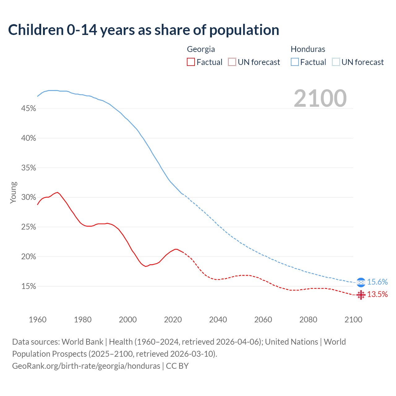 According to the latest available data on birth rates, the fertility rate in Georgia was 1.81 children per woman in 2023, compared to 2.5 in Honduras in 2023. The replacement level is considered to be 2.1 children per woman.