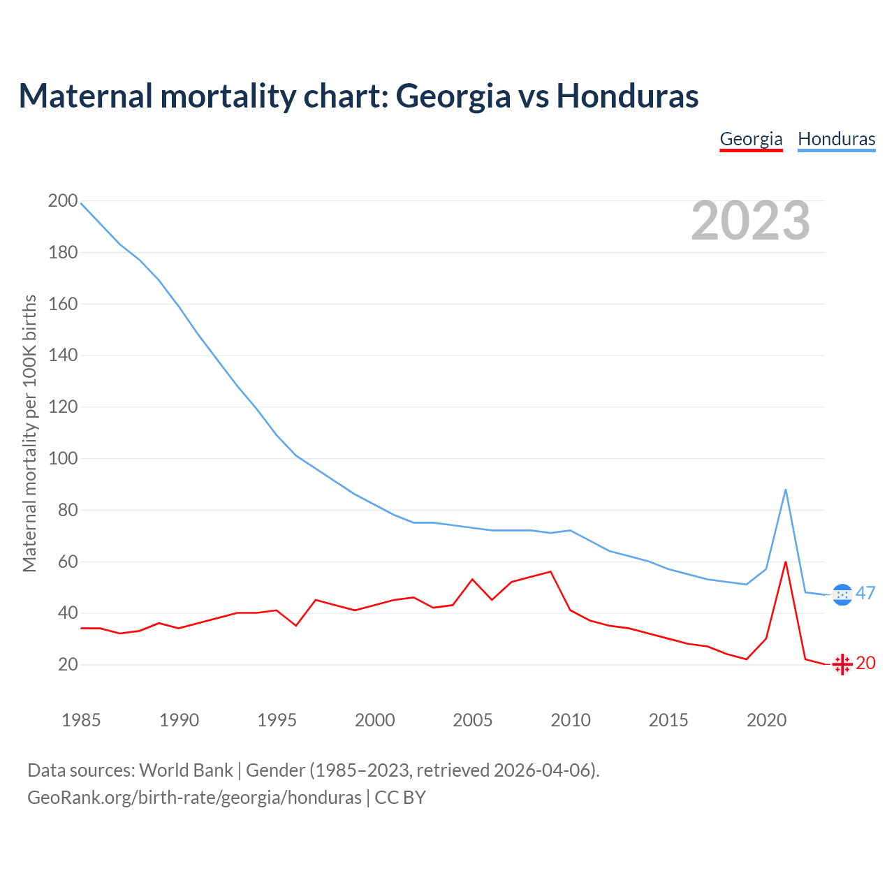 The maternal mortality rate, which is the probability of dying during childbirth or within 42 days of pregnancy termination, is 20 deaths per 100,000 live births in Georgia, compared to 47 deaths in Honduras.
