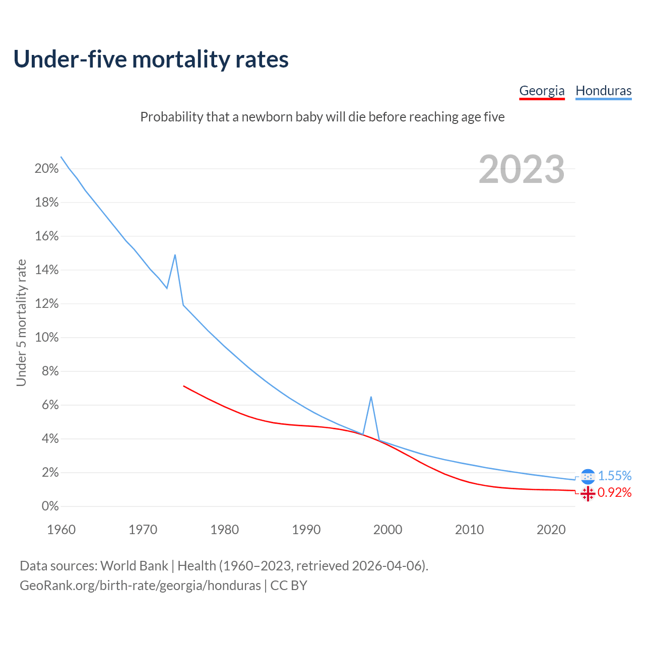 The chance that a newborn baby will die before reaching age five is 0.92% in Georgia and 1.55% in Honduras. Above is a chart with historical data on under-five mortality rates.