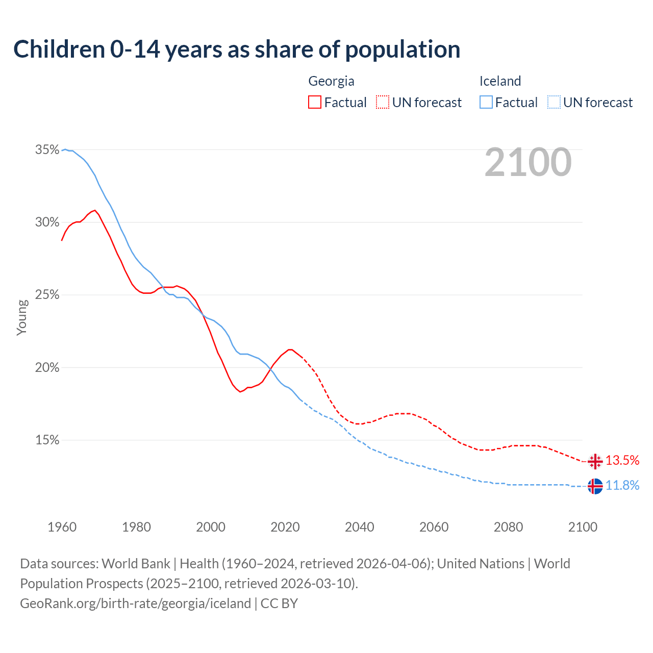 According to the latest available data on birth rates, the fertility rate in Georgia was 1.81 children per woman in 2023, compared to 1.59 in Iceland in 2023. The replacement level is considered to be 2.1 children per woman.