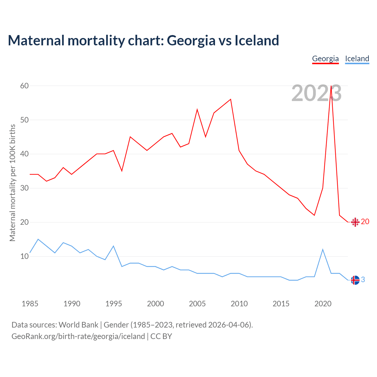 The maternal mortality rate, which is the probability of dying during childbirth or within 42 days of pregnancy termination, is 20 deaths per 100,000 live births in Georgia, compared to 3 deaths in Iceland.