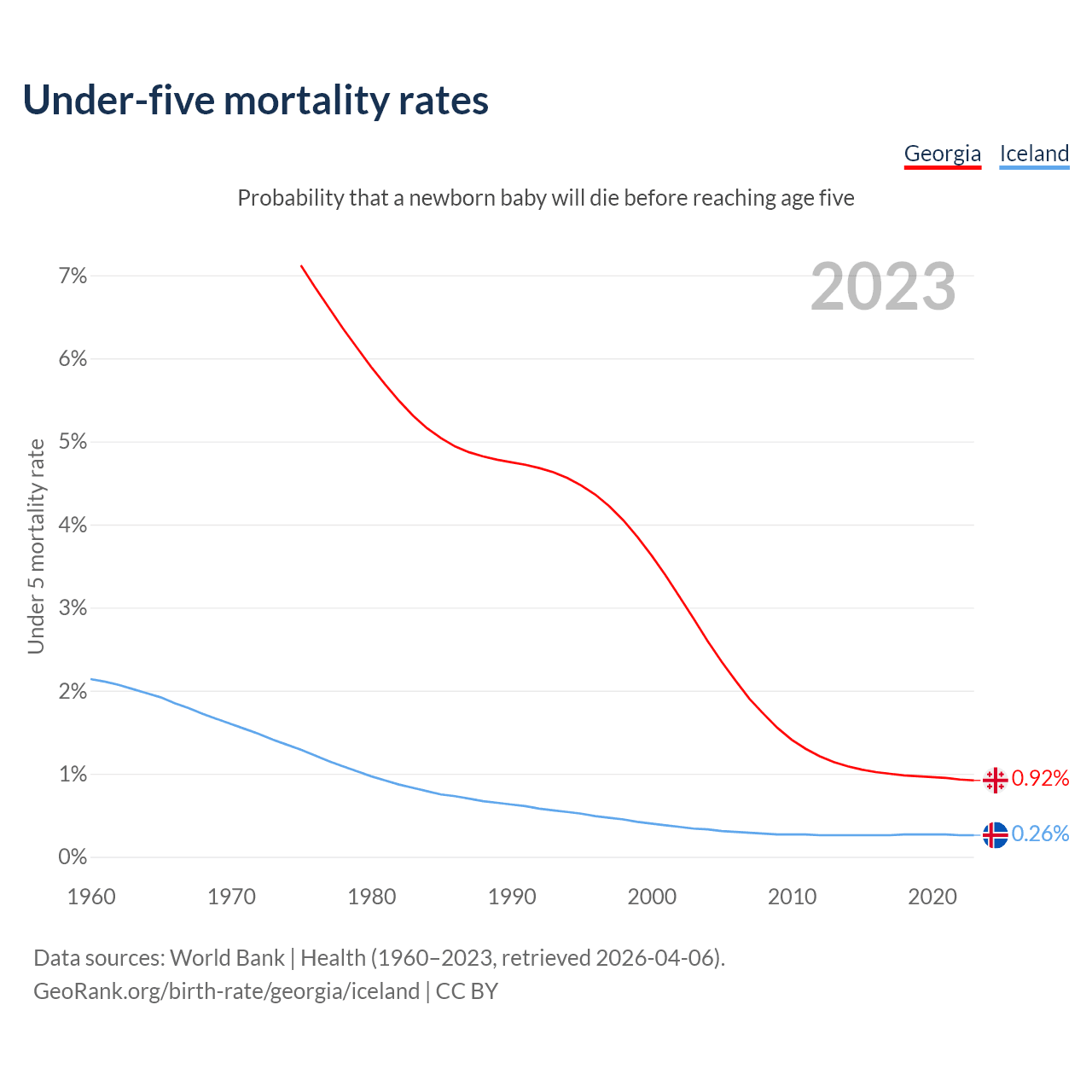 The chance that a newborn baby will die before reaching age five is 0.92% in Georgia and 0.26% in Iceland. Above is a chart with historical data on under-five mortality rates.