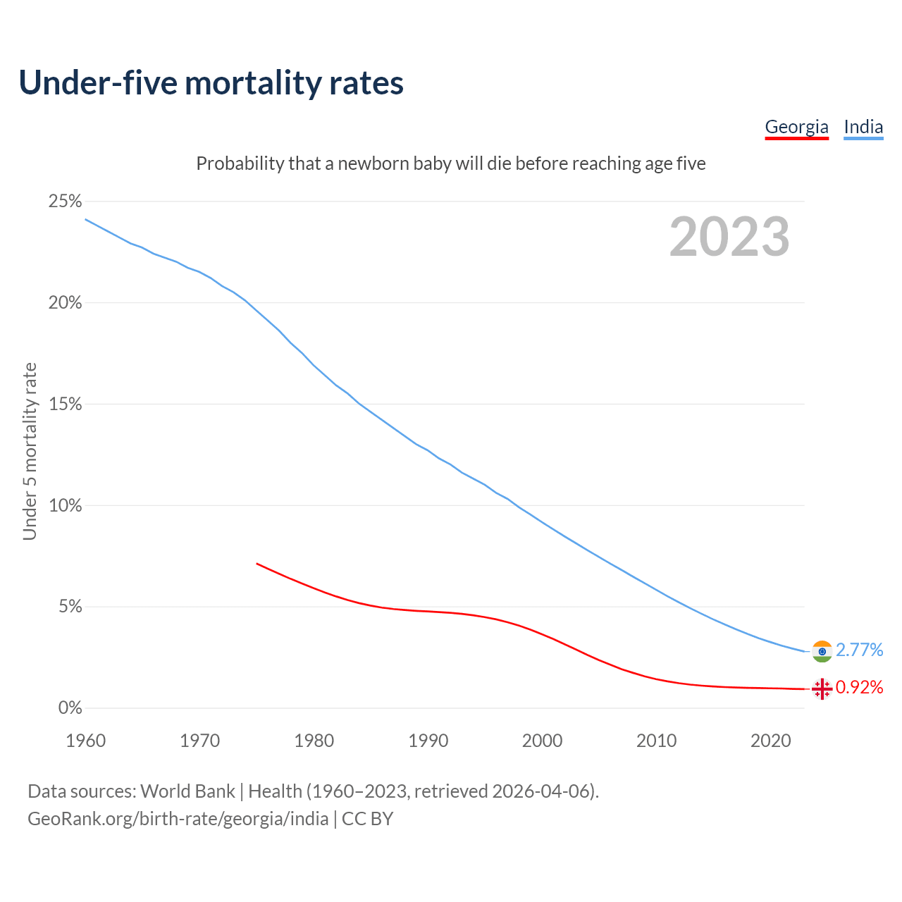 The chance that a newborn baby will die before reaching age five is 0.92% in Georgia and 2.77% in India. Above is a chart with historical data on under-five mortality rates.