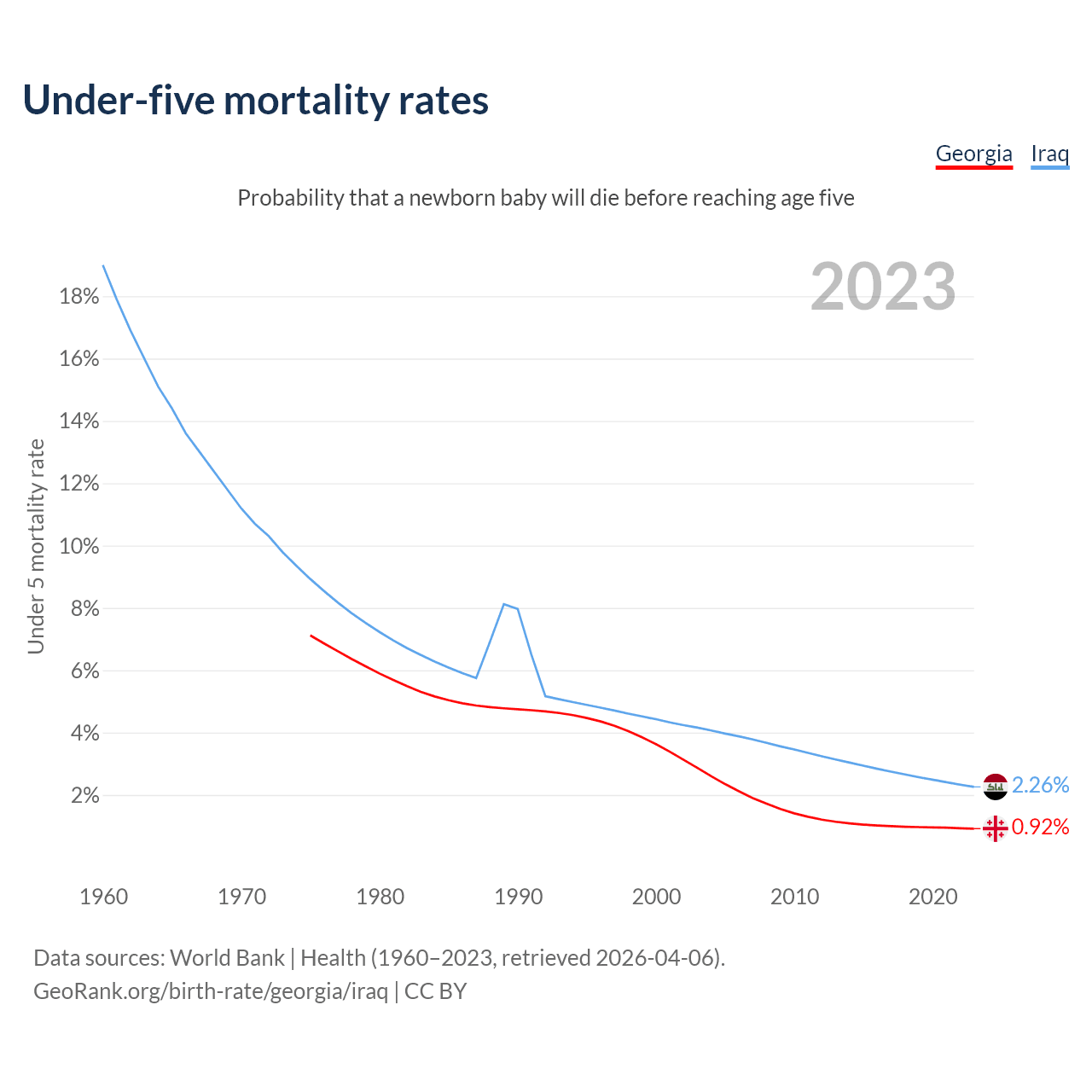 The chance that a newborn baby will die before reaching age five is 0.92% in Georgia and 2.26% in Iraq. Above is a chart with historical data on under-five mortality rates.