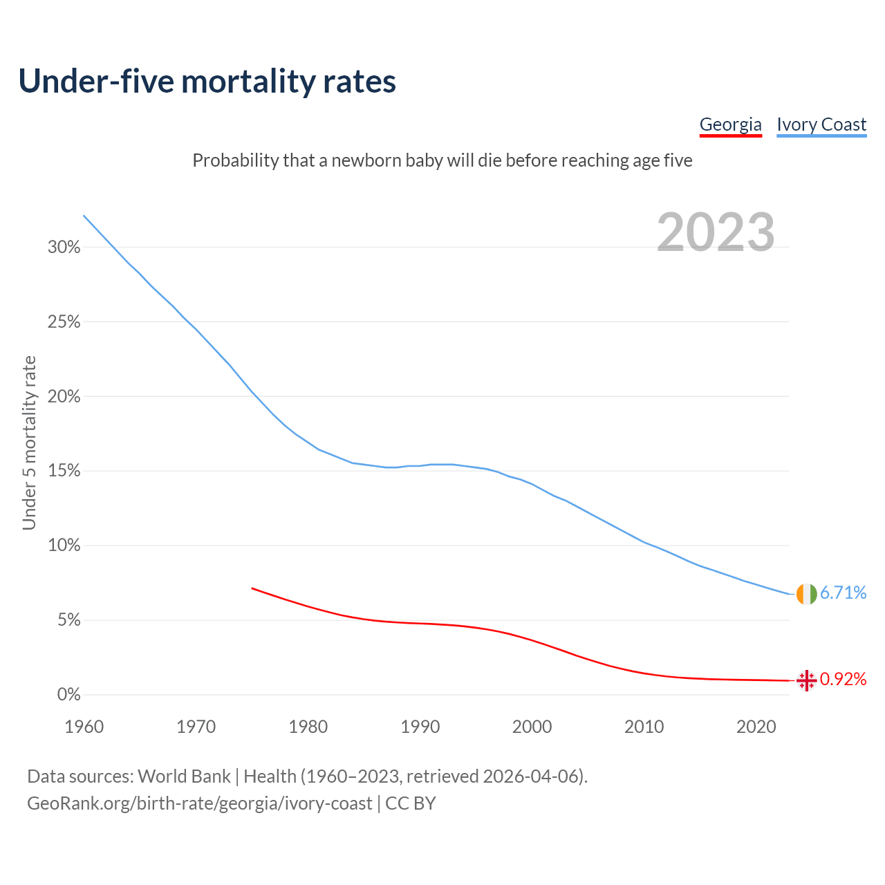 The chance that a newborn baby will die before reaching age five is 0.92% in Georgia and 6.71% in Ivory Coast. Above is a chart with historical data on under-five mortality rates.