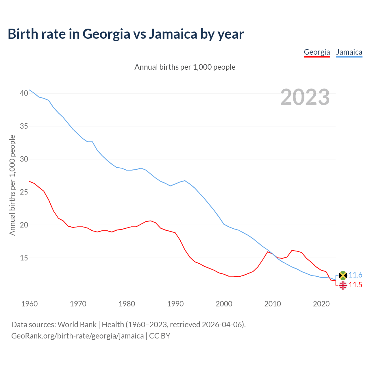 Georgia has an annual birth rate of 11.5 births per 1,000 people, compared to 11.6 for Jamaica. The average number of children a woman is expected to have during her lifetime — the fertility rate, is 1.81 in Georgia and 1.36 in Jamaica — 25% difference.