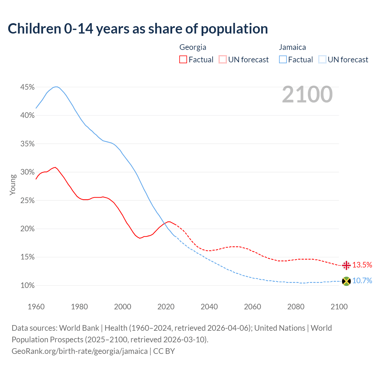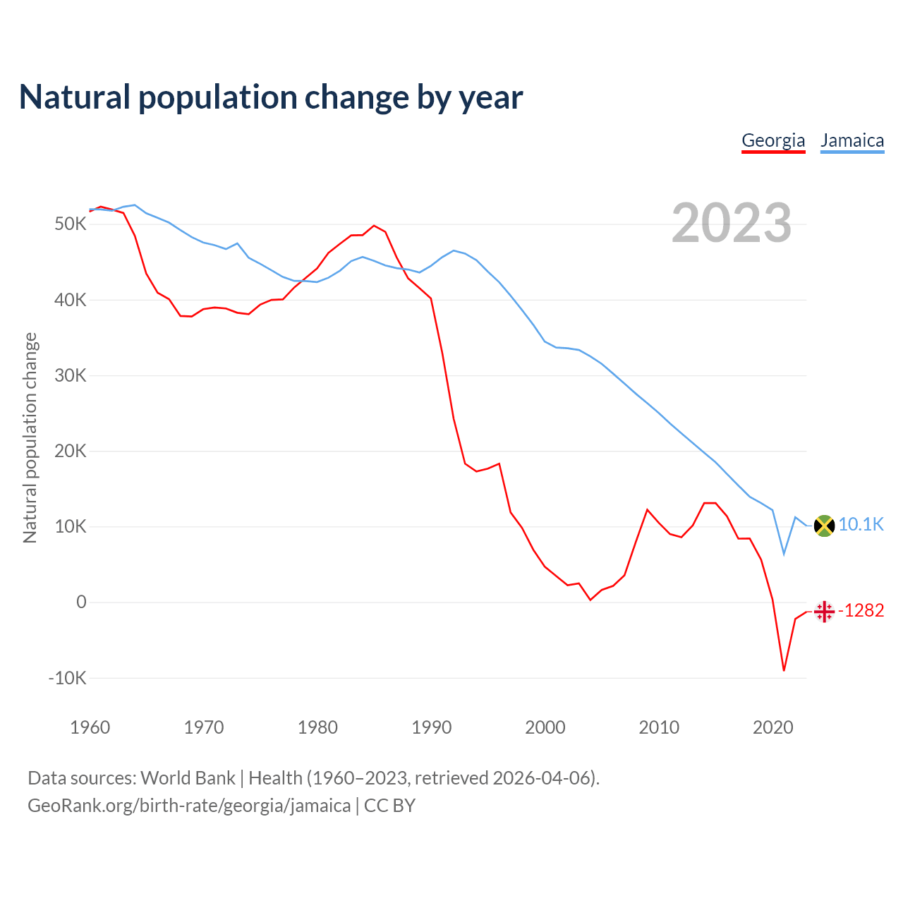 According to the latest available data on birth rates, the fertility rate in Georgia was 1.81 children per woman in 2023, compared to 1.36 in Jamaica in 2023. The replacement level is considered to be 2.1 children per woman.