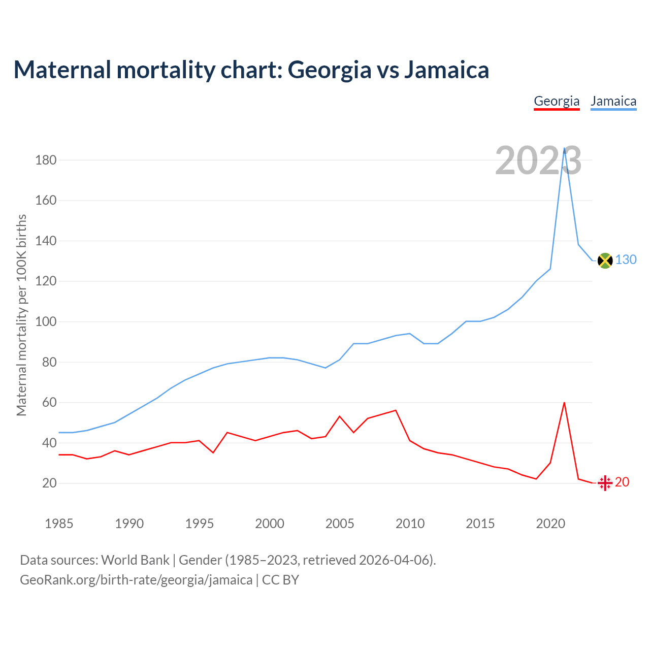 The maternal mortality rate, which is the probability of dying during childbirth or within 42 days of pregnancy termination, is 20 deaths per 100,000 live births in Georgia, compared to 130 deaths in Jamaica.