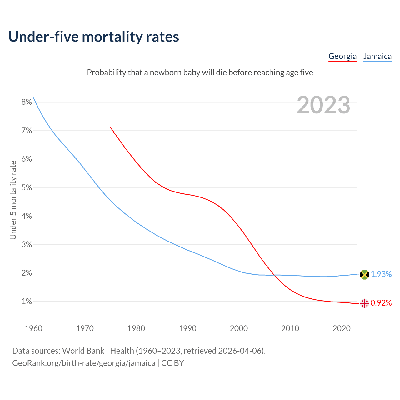 The chance that a newborn baby will die before reaching age five is 0.92% in Georgia and 1.93% in Jamaica. Above is a chart with historical data on under-five mortality rates.
