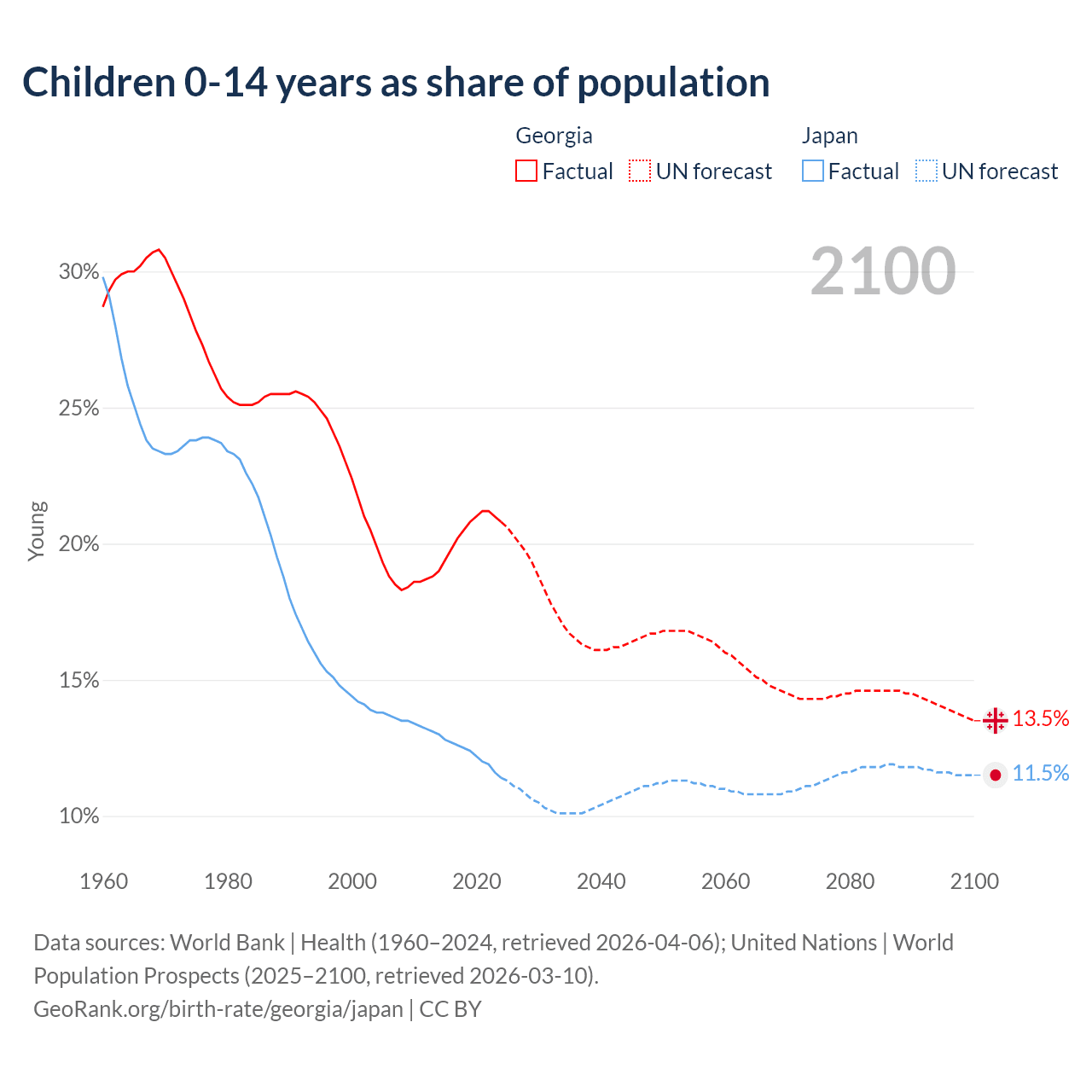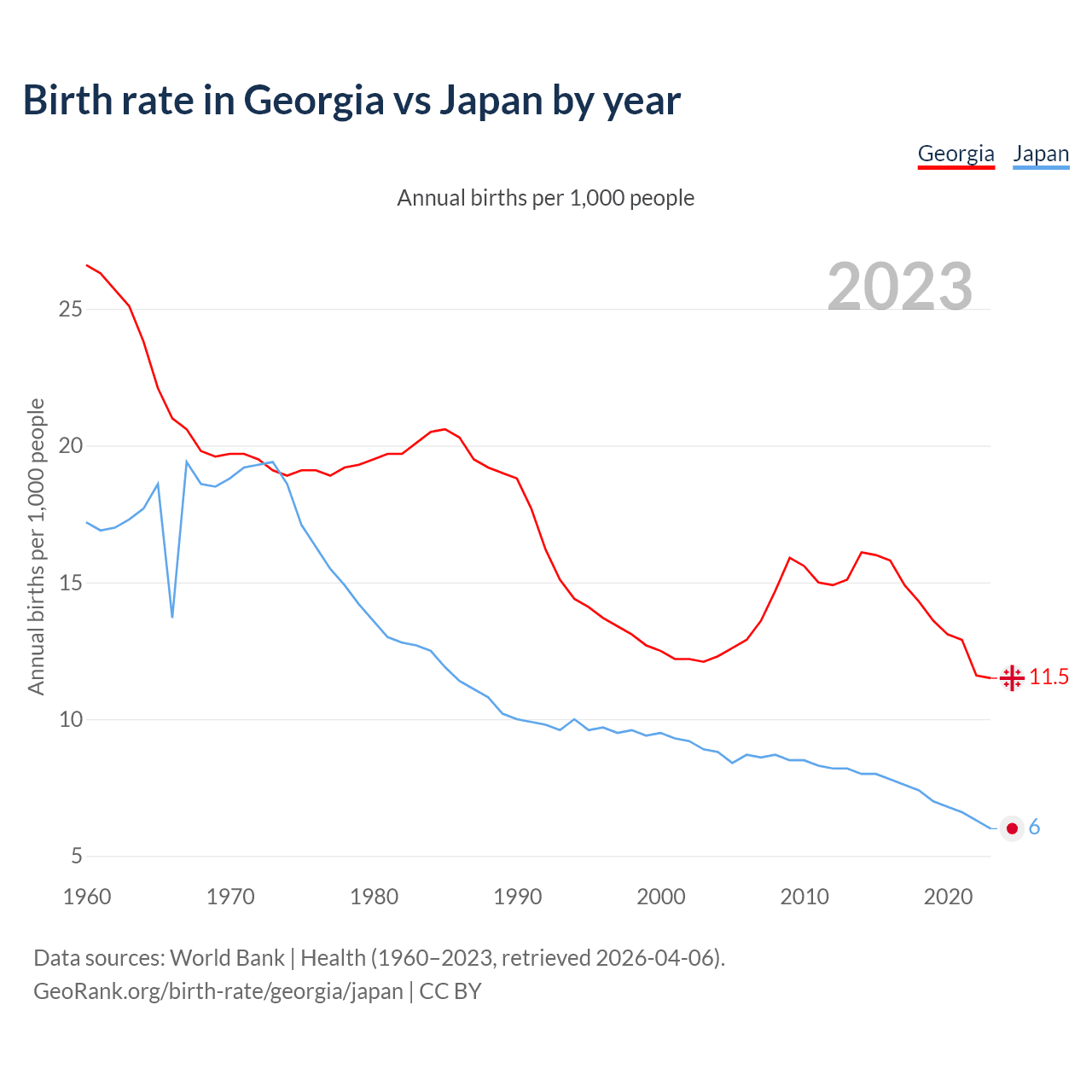 Georgia has an annual birth rate of 11.5 births per 1,000 people, compared to 6 for Japan. The average number of children a woman is expected to have during her lifetime — the fertility rate, is 1.81 in Georgia and 1.2 in Japan — 33.7% difference.