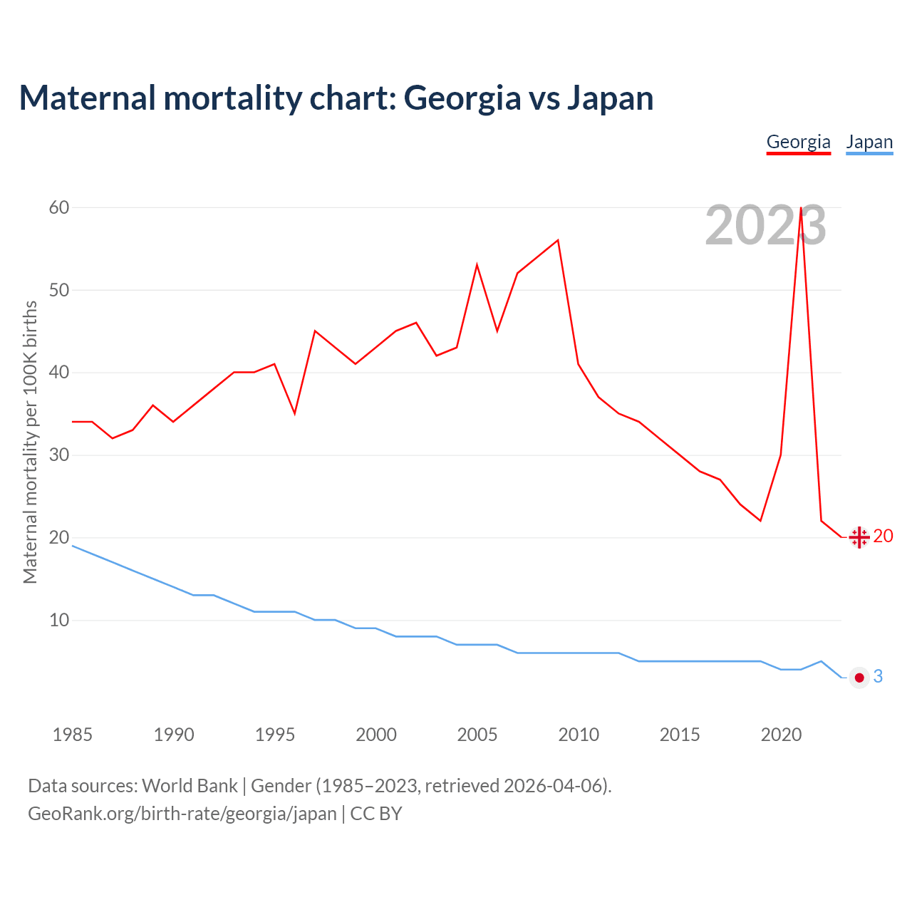 The maternal mortality rate, which is the probability of dying during childbirth or within 42 days of pregnancy termination, is 20 deaths per 100,000 live births in Georgia, compared to 3 deaths in Japan.