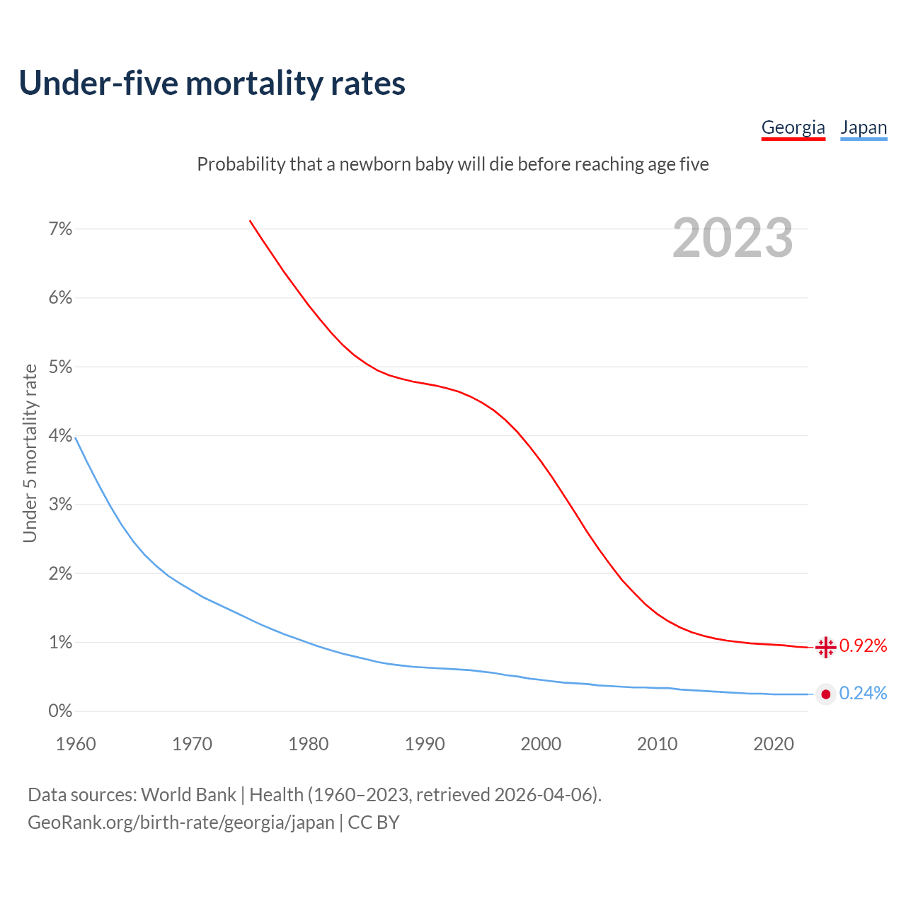 The chance that a newborn baby will die before reaching age five is 0.92% in Georgia and 0.24% in Japan. Above is a chart with historical data on under-five mortality rates.