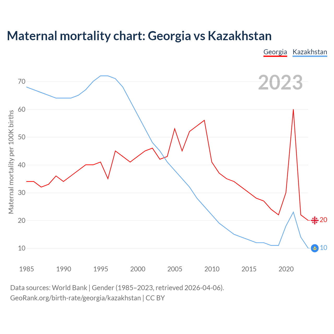 The maternal mortality rate, which is the probability of dying during childbirth or within 42 days of pregnancy termination, is 20 deaths per 100,000 live births in Georgia, compared to 10 deaths in Kazakhstan.