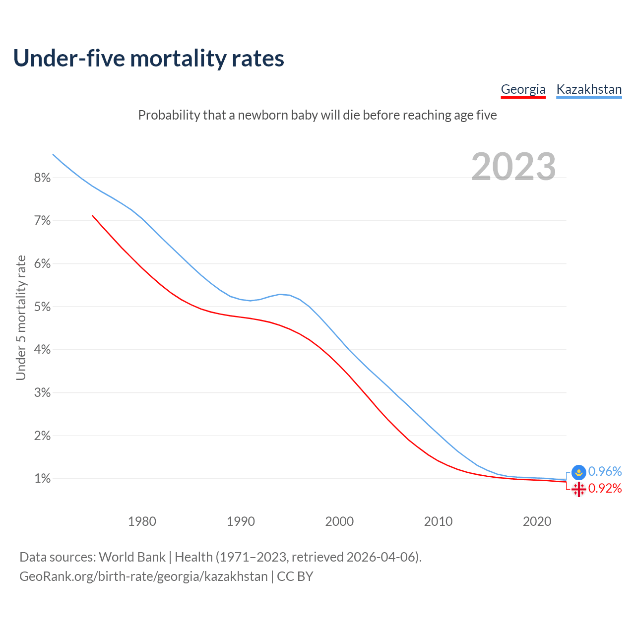 The chance that a newborn baby will die before reaching age five is 0.92% in Georgia and 0.96% in Kazakhstan. Above is a chart with historical data on under-five mortality rates.