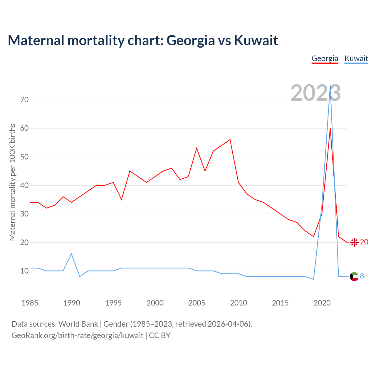 The maternal mortality rate, which is the probability of dying during childbirth or within 42 days of pregnancy termination, is 20 deaths per 100,000 live births in Georgia, compared to 8 deaths in Kuwait.