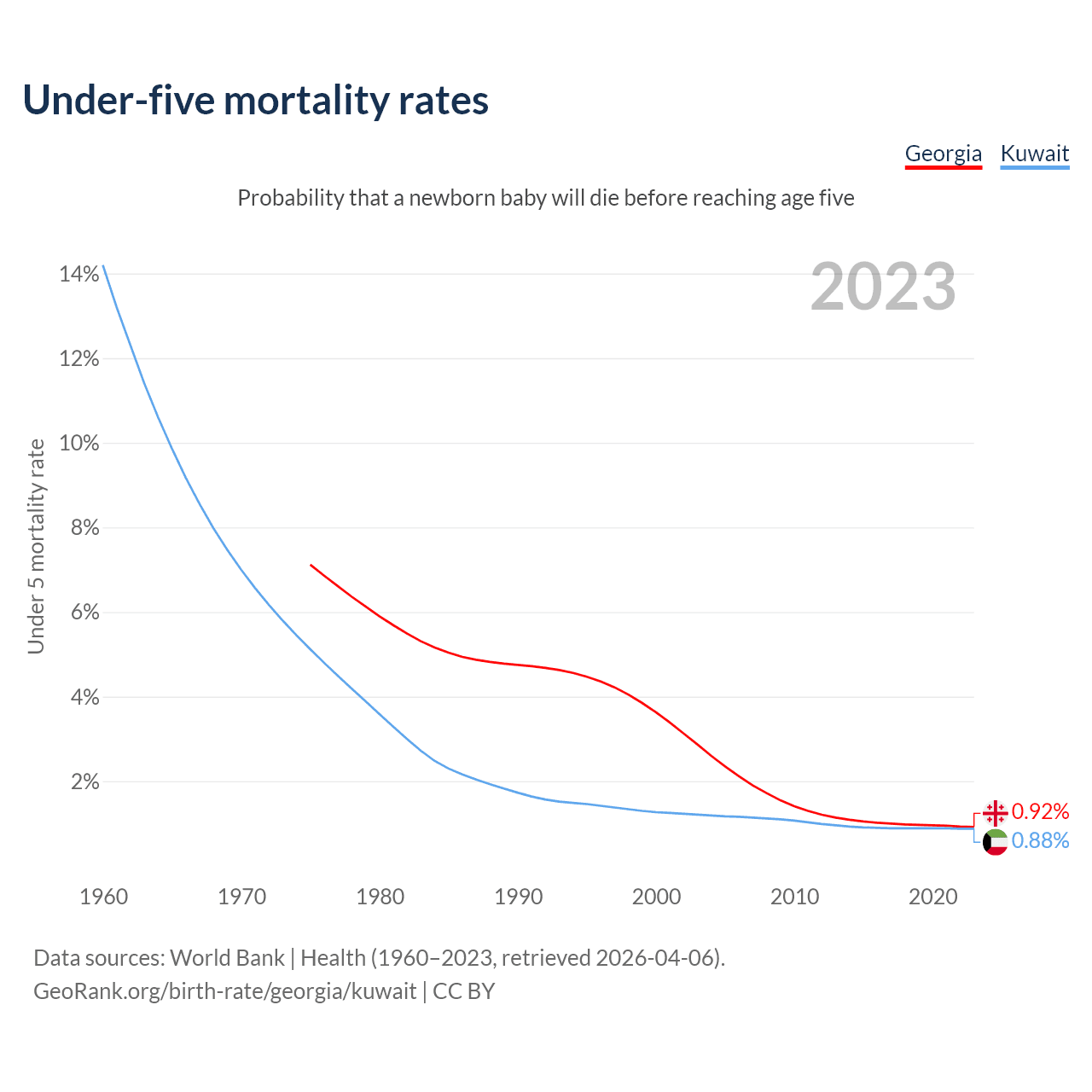 The chance that a newborn baby will die before reaching age five is 0.92% in Georgia and 0.88% in Kuwait. Above is a chart with historical data on under-five mortality rates.