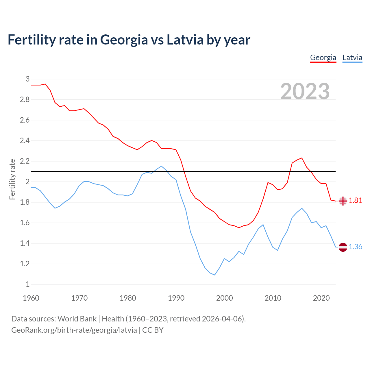 According to the latest available data on birth rates, the fertility rate in Georgia was 1.81 children per woman in 2023, compared to 1.36 in Latvia in 2023. The replacement level is considered to be 2.1 children per woman.