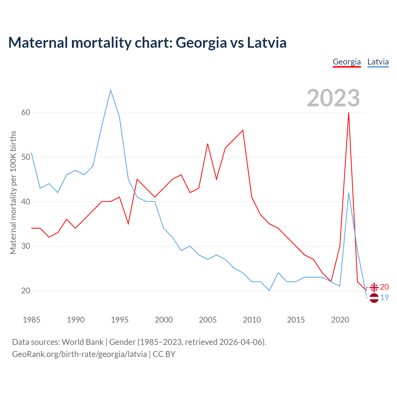 The maternal mortality rate, which is the probability of dying during childbirth or within 42 days of pregnancy termination, is 20 deaths per 100,000 live births in Georgia, compared to 19 deaths in Latvia.
