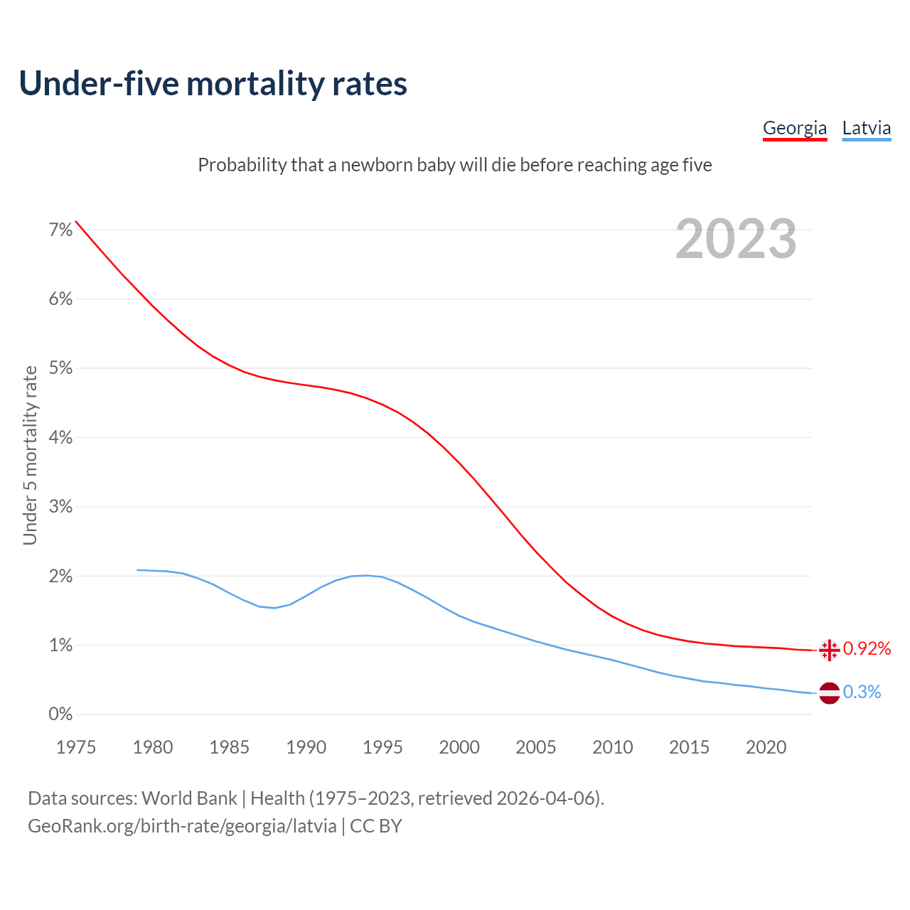 The chance that a newborn baby will die before reaching age five is 0.92% in Georgia and 0.3% in Latvia. Above is a chart with historical data on under-five mortality rates.