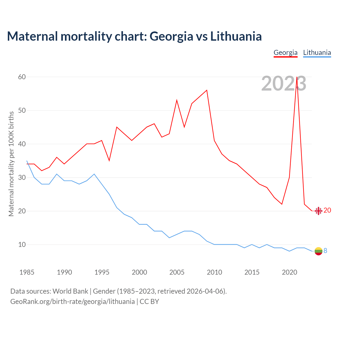 The maternal mortality rate, which is the probability of dying during childbirth or within 42 days of pregnancy termination, is 20 deaths per 100,000 live births in Georgia, compared to 8 deaths in Lithuania.
