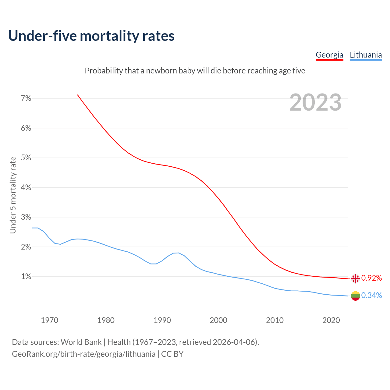 The chance that a newborn baby will die before reaching age five is 0.92% in Georgia and 0.34% in Lithuania. Above is a chart with historical data on under-five mortality rates.