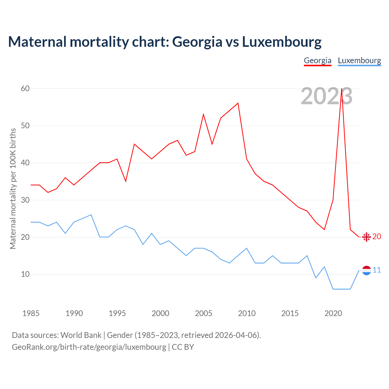 The maternal mortality rate, which is the probability of dying during childbirth or within 42 days of pregnancy termination, is 20 deaths per 100,000 live births in Georgia, compared to 11 deaths in Luxembourg.