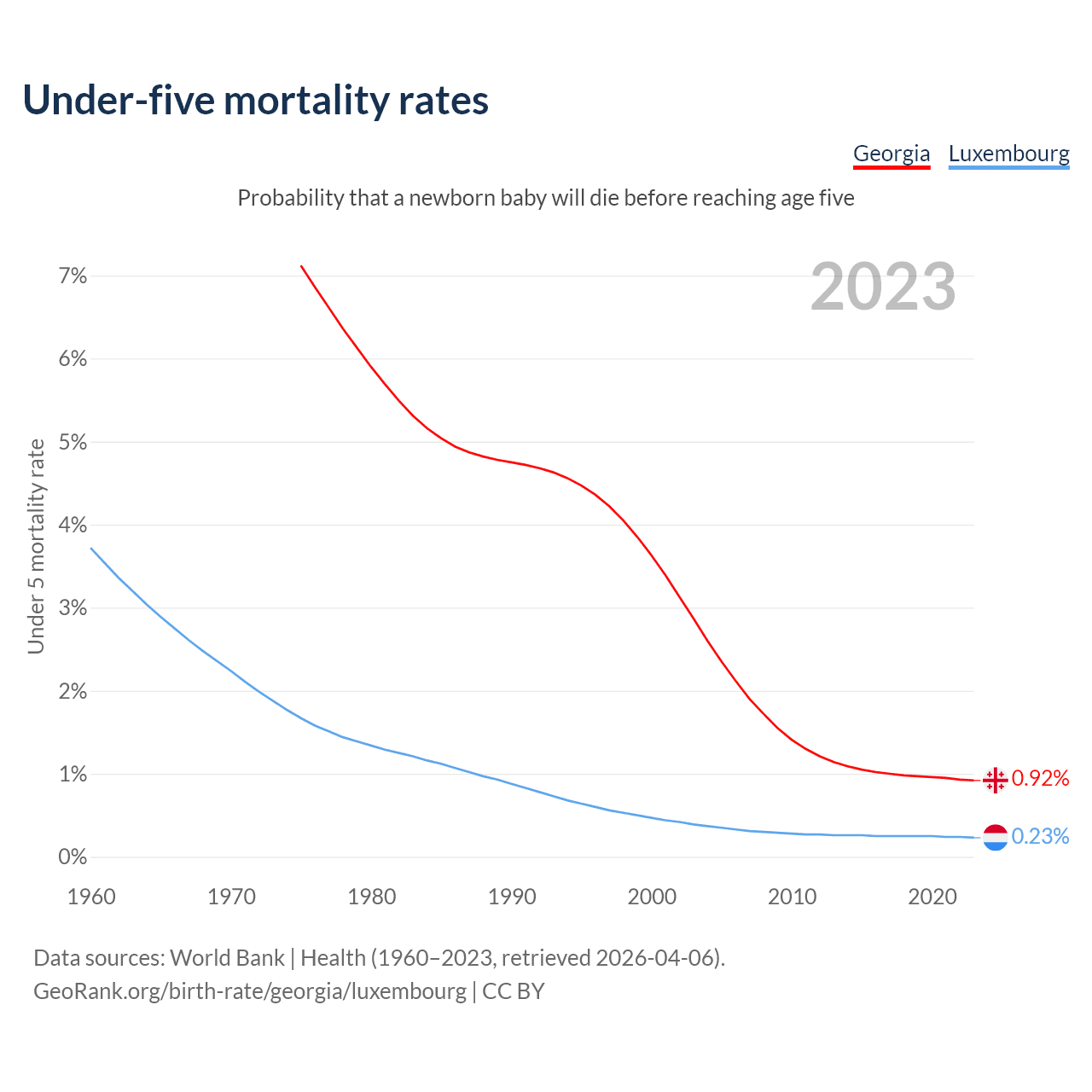 The chance that a newborn baby will die before reaching age five is 0.92% in Georgia and 0.23% in Luxembourg. Above is a chart with historical data on under-five mortality rates.