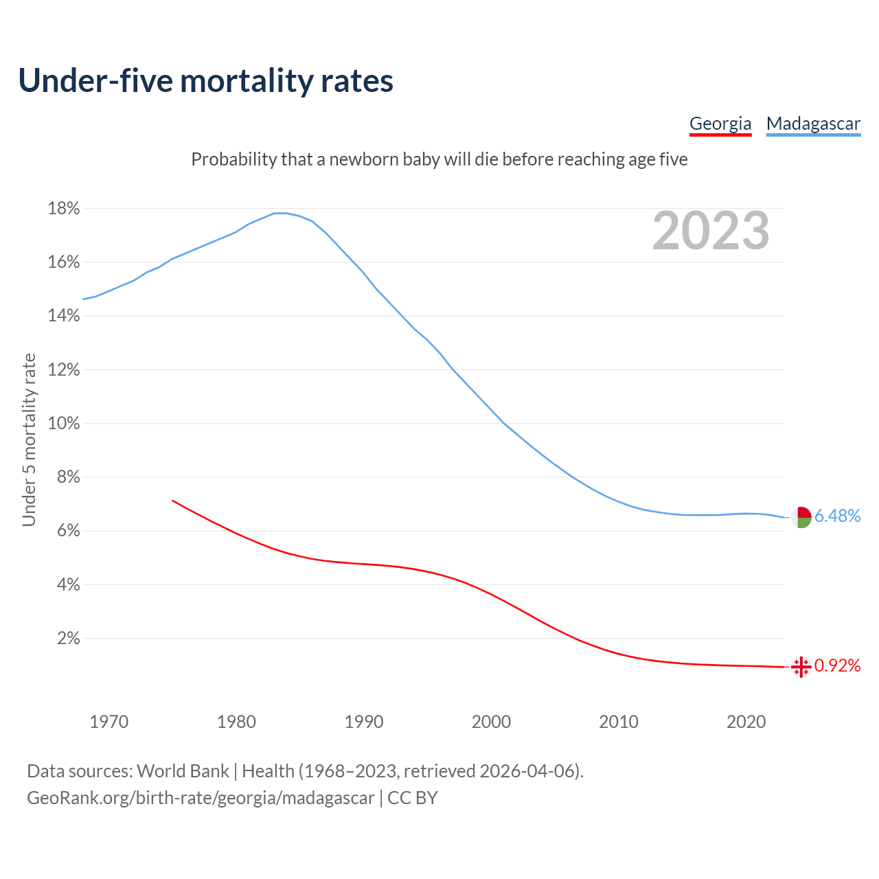 The chance that a newborn baby will die before reaching age five is 0.92% in Georgia and 6.48% in Madagascar. Above is a chart with historical data on under-five mortality rates.