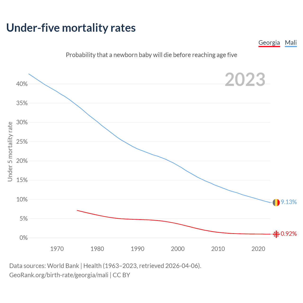 The chance that a newborn baby will die before reaching age five is 0.92% in Georgia and 9.13% in Mali. Above is a chart with historical data on under-five mortality rates.