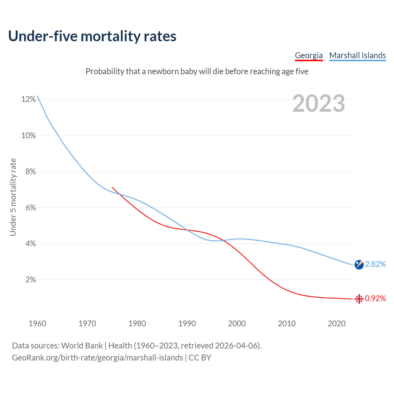 The chance that a newborn baby will die before reaching age five is 0.92% in Georgia and 2.82% in the Marshall Islands. Above is a chart with historical data on under-five mortality rates.