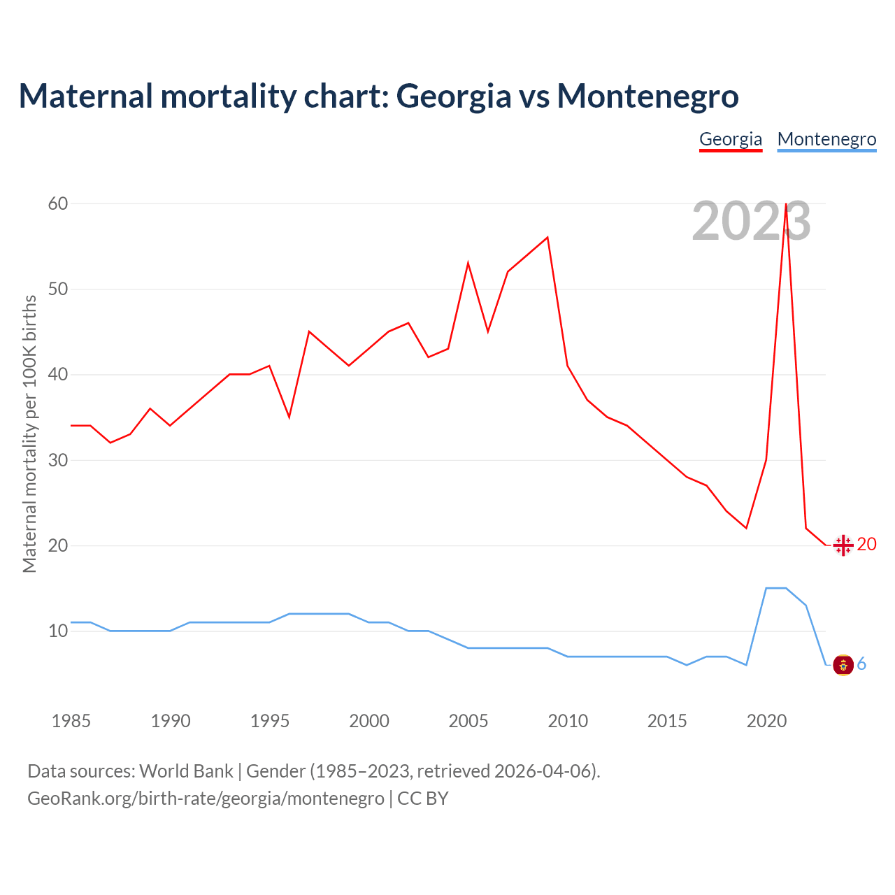 The maternal mortality rate, which is the probability of dying during childbirth or within 42 days of pregnancy termination, is 20 deaths per 100,000 live births in Georgia, compared to 6 deaths in Montenegro.