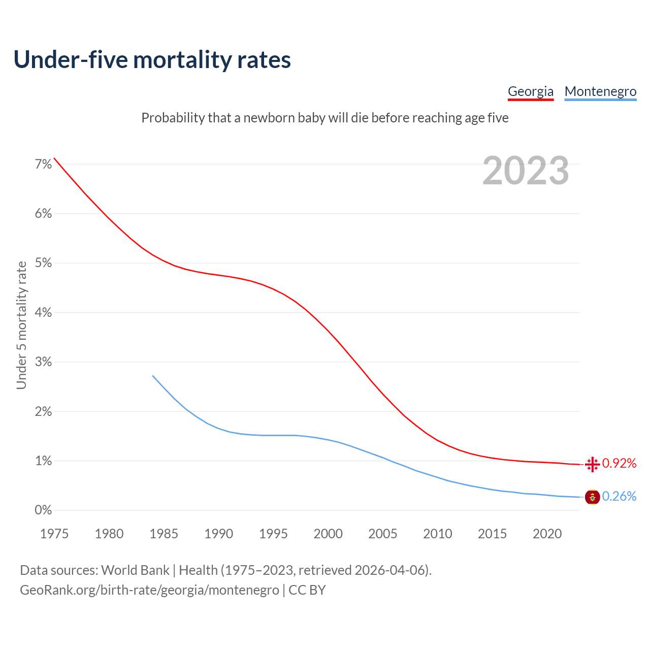 The chance that a newborn baby will die before reaching age five is 0.92% in Georgia and 0.26% in Montenegro. Above is a chart with historical data on under-five mortality rates.