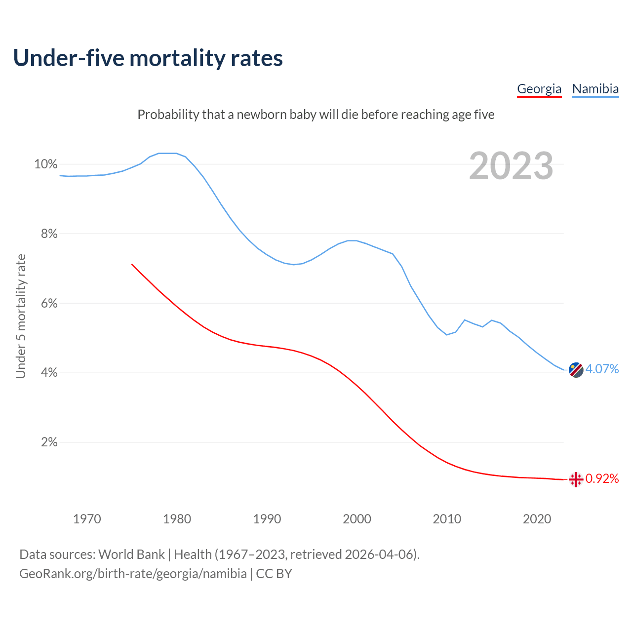 The chance that a newborn baby will die before reaching age five is 0.92% in Georgia and 4.07% in Namibia. Above is a chart with historical data on under-five mortality rates.