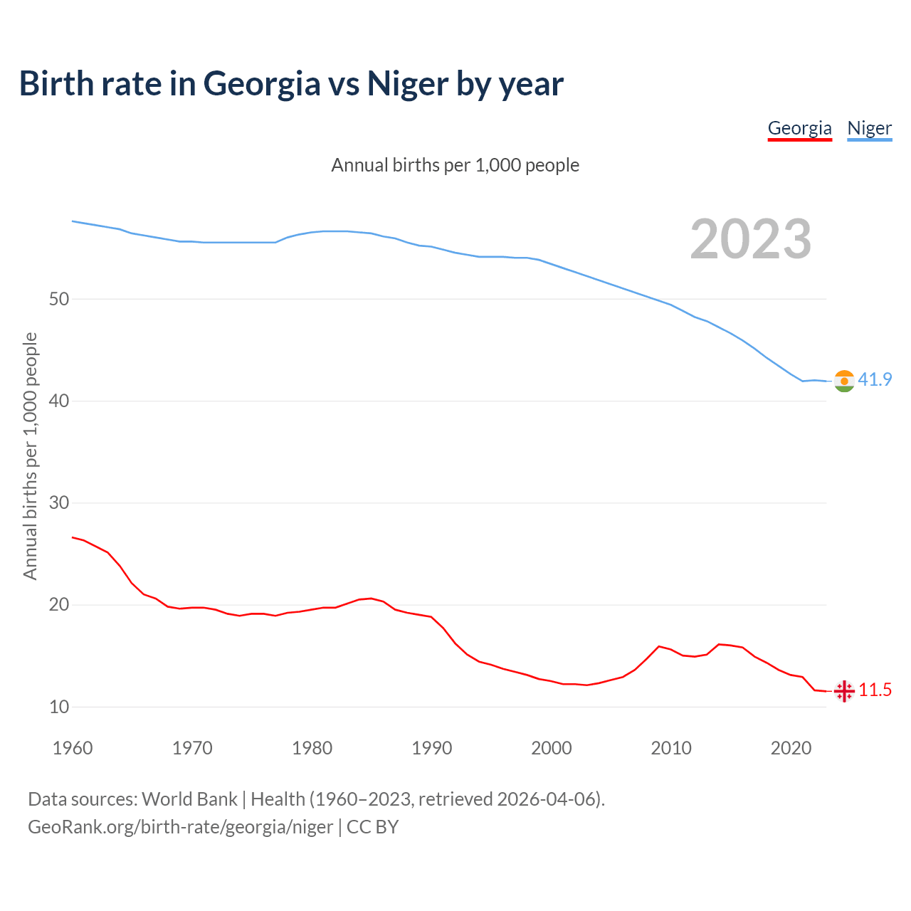 Georgia has an annual birth rate of 11.5 births per 1,000 people, compared to 41.9 for Niger. The average number of children a woman is expected to have during her lifetime — the fertility rate, is 1.81 in Georgia and 6.06 in Niger — 234.9% difference.