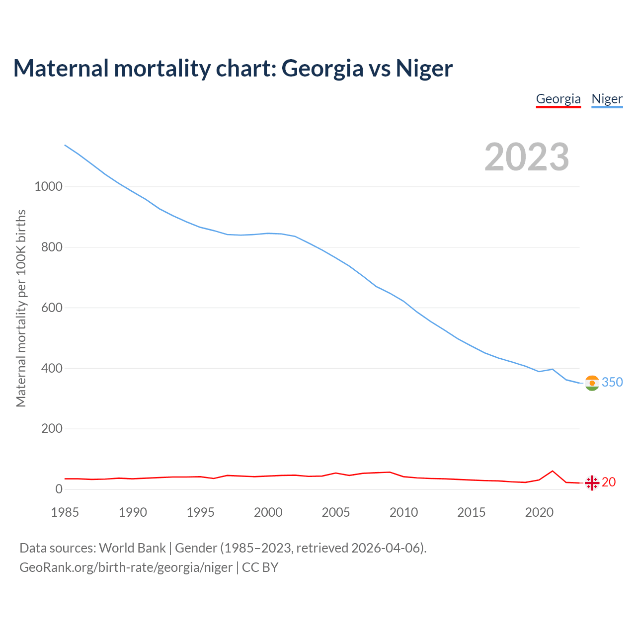 The maternal mortality rate, which is the probability of dying during childbirth or within 42 days of pregnancy termination, is 20 deaths per 100,000 live births in Georgia, compared to 350 deaths in Niger.
