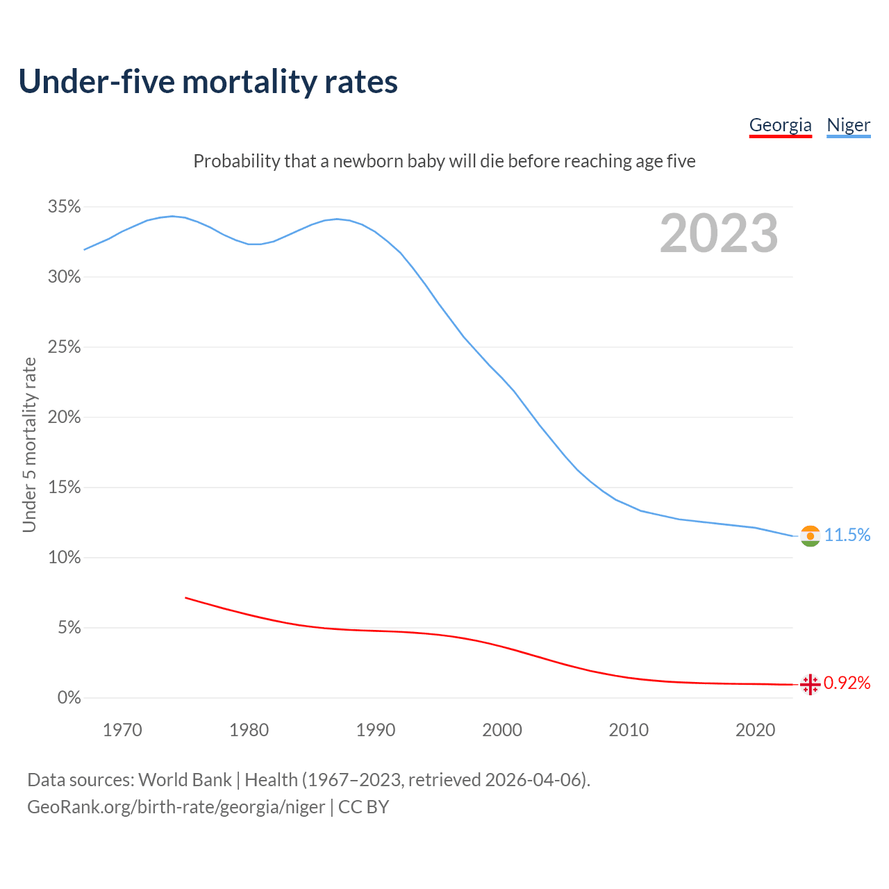 The chance that a newborn baby will die before reaching age five is 0.92% in Georgia and 11.5% in Niger. Above is a chart with historical data on under-five mortality rates.